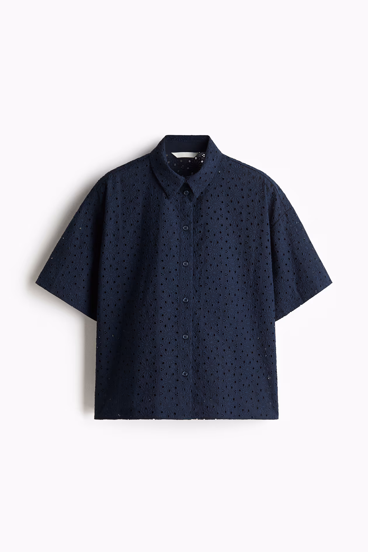Shirt in eyelet-embroidered woven cotton. Collar, buttons at front, dropped shoulders, and elbow-length sleeves.
