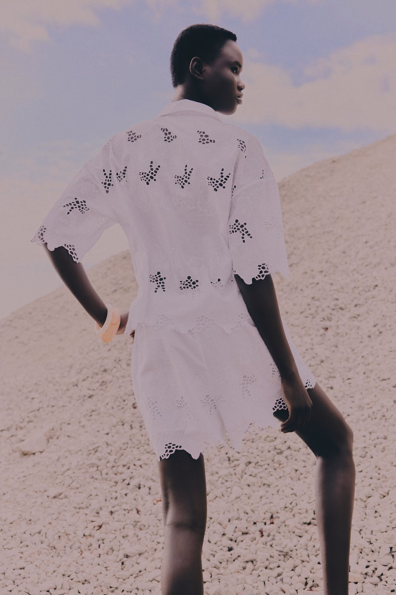 Loose-fit shorts in airy woven cotton with eyelet embroidery. High paper-bag waist, narrow drawstring and covered elastic at waistband, and scalloped-edge hems. Lined.
