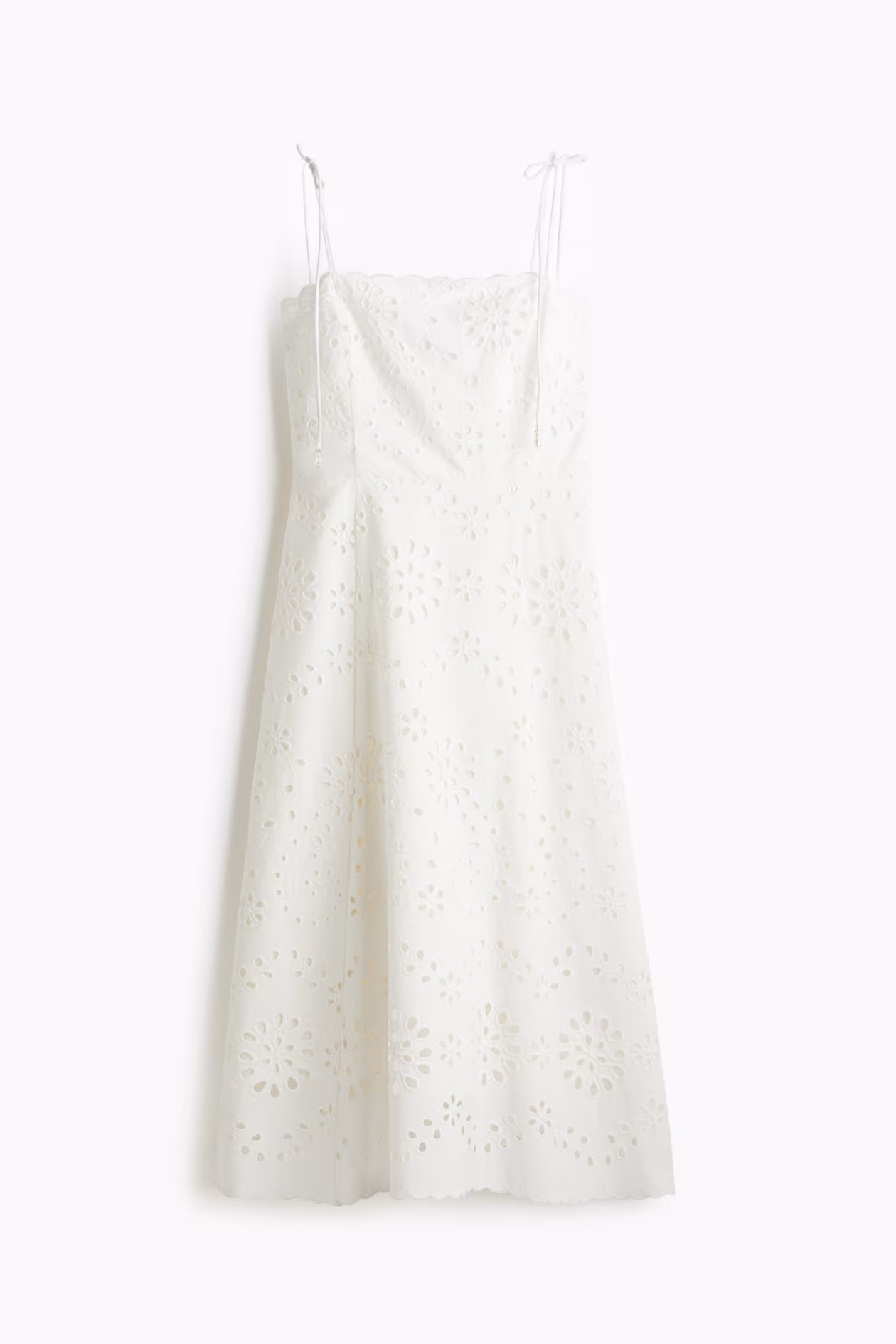 Fitted, calf-length dress in eyelet embroidered cotton poplin. Tie-top shoulder straps with a pearlescent bead at ends, straight-cut neckline, a seam at waist, and a concealed zipper at one side. Scalloped edges at neckline and hem. Partly lined.