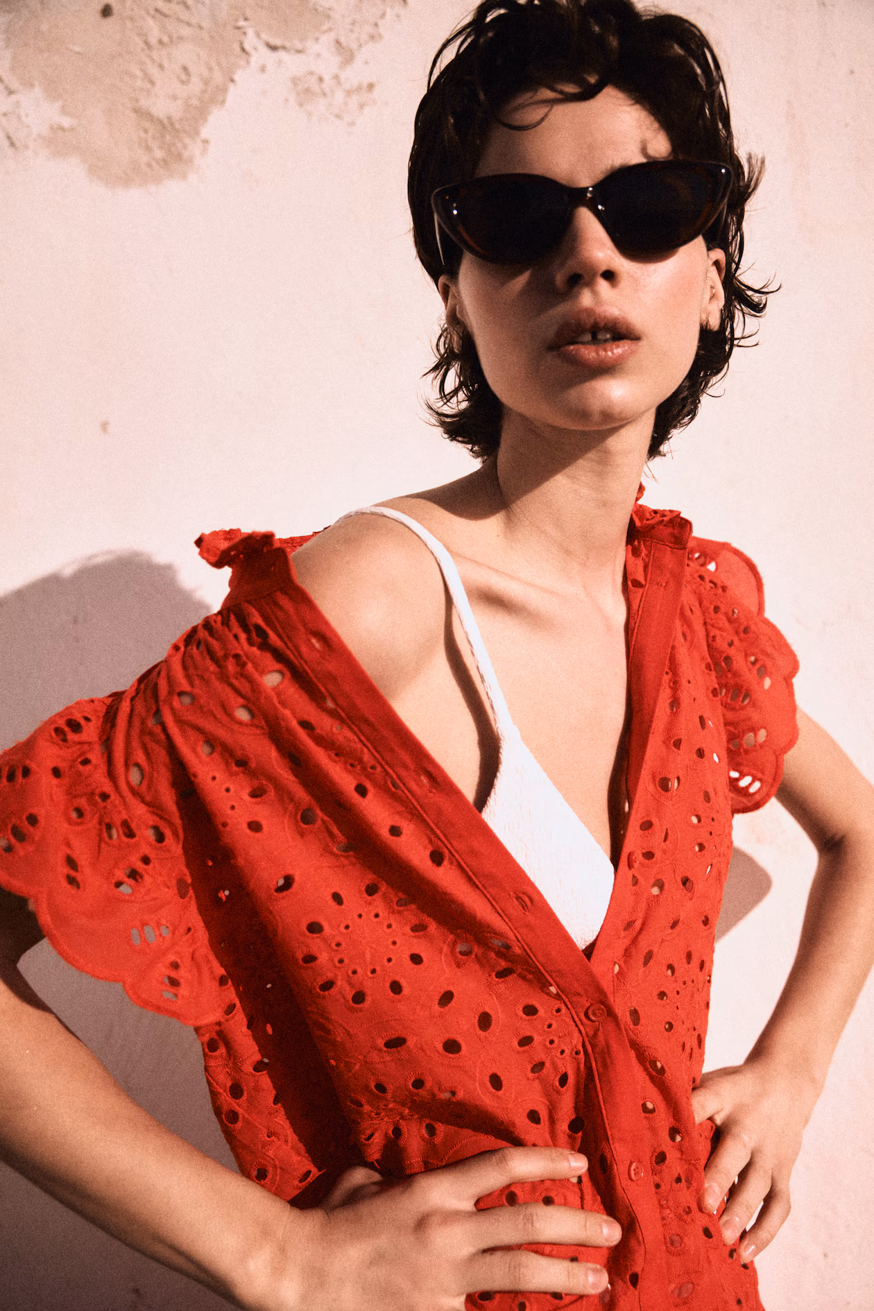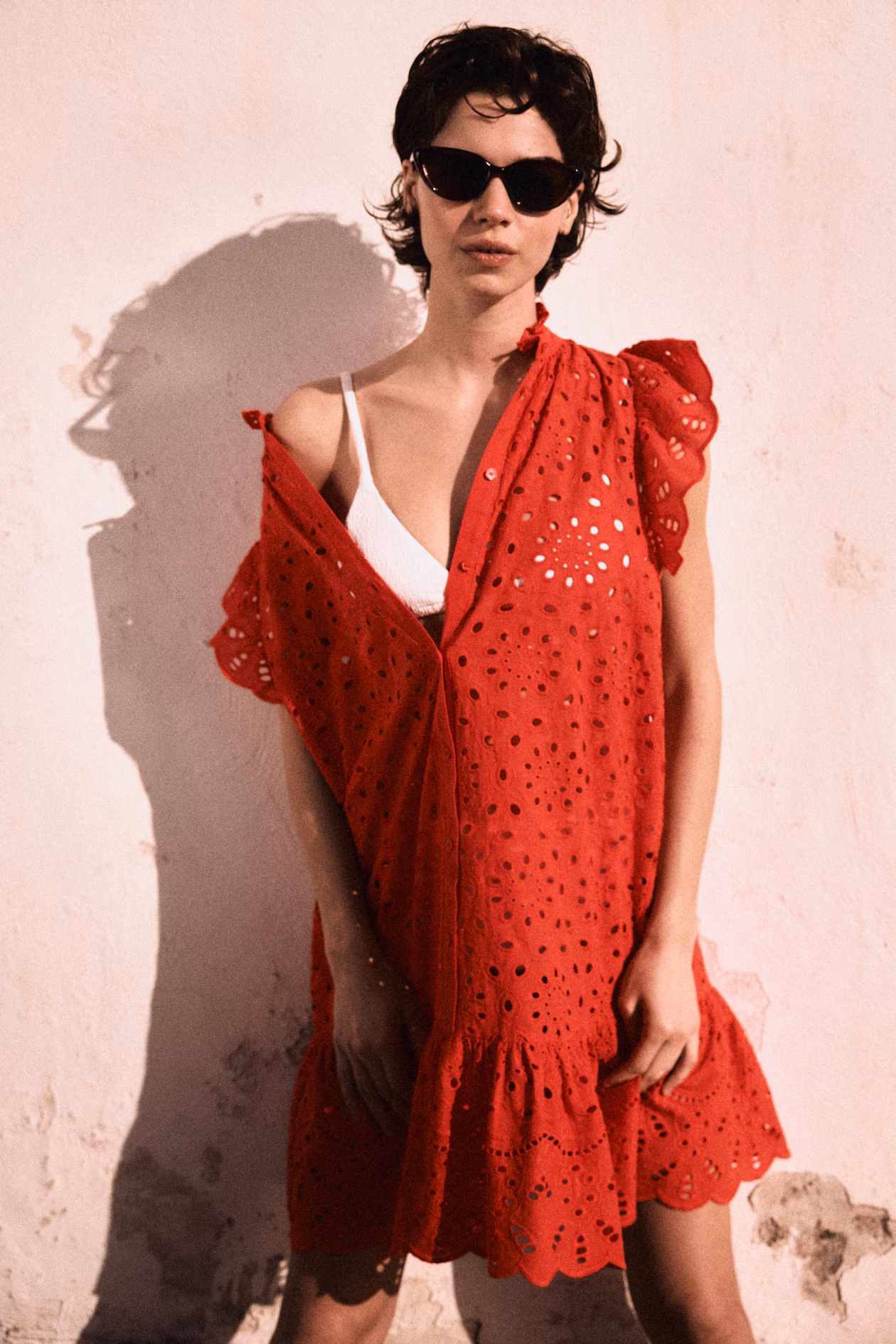 Short, flutter-sleeved dress in eyelet-embroidered woven cotton. Ruffle-trimmed collar, buttons at front, and a gathered seam above hem for added volume. Cotton liner dress.