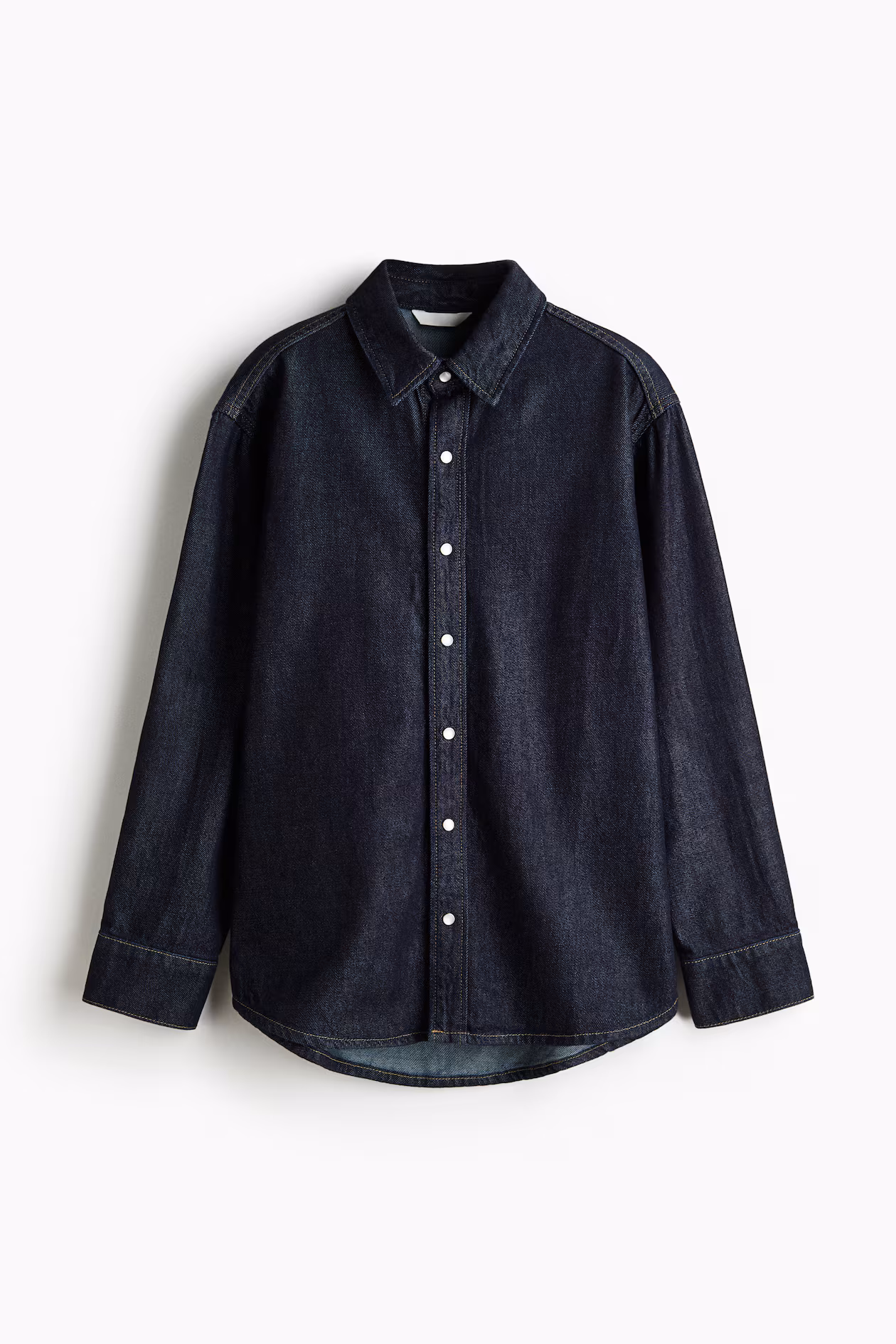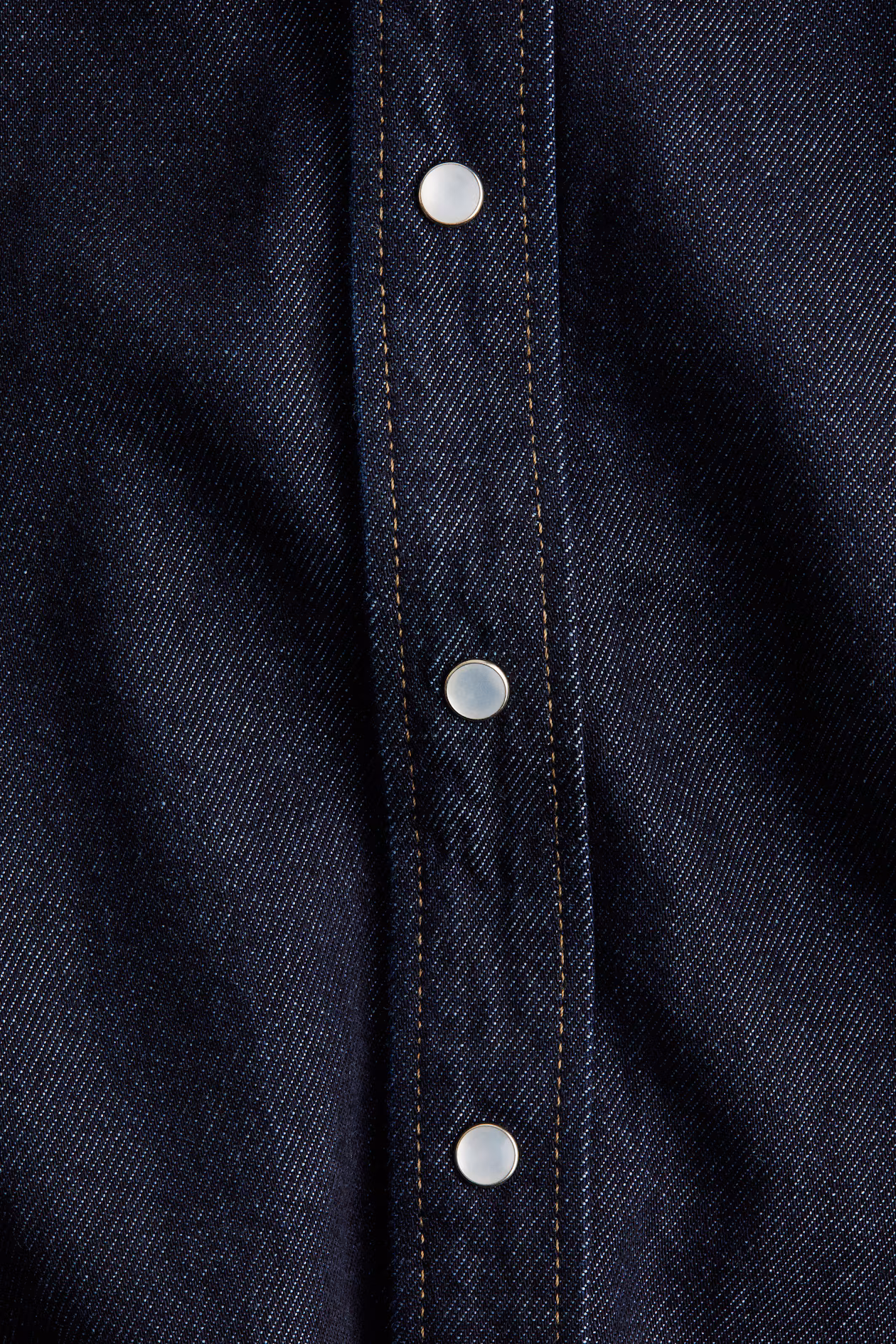 Long shirt in supersoft, featherlight denim. Collar, snap fasteners at front, and yoke at back with box pleat. Forward-facing shoulder seams, dropped shoulders, and long sleeves with snap fasteners at cuffs. Curved hem with side vents.