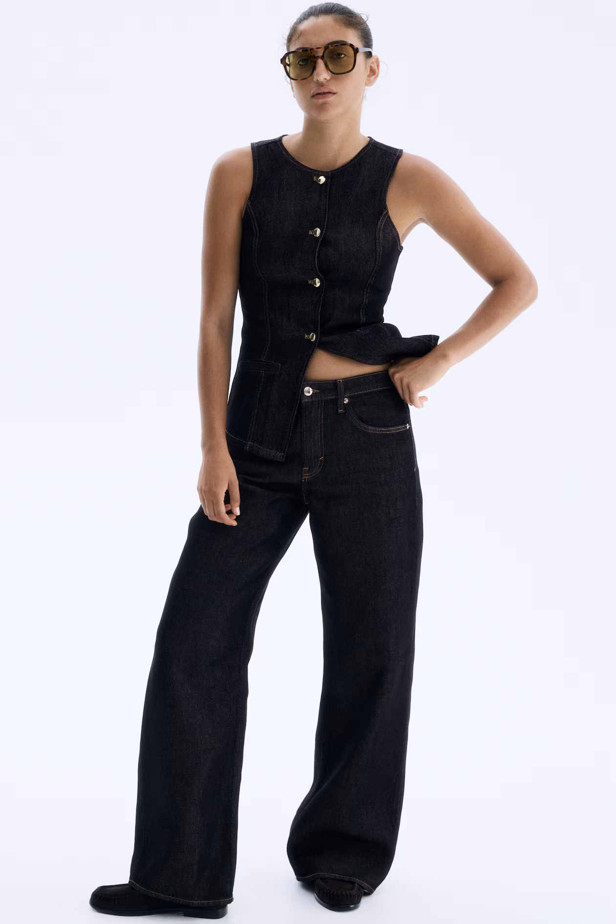 5-pocket jeans in supersoft, featherlight denim. Regular fit from waist to hip and wide cut from thigh to hem. Regular waist and zip fly with button. Wide, longer legs, designed to fall over foot with a stacking effect. Effortlessly flattering no matter how they're styled.