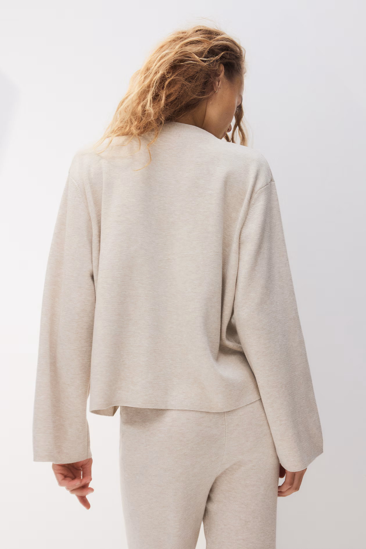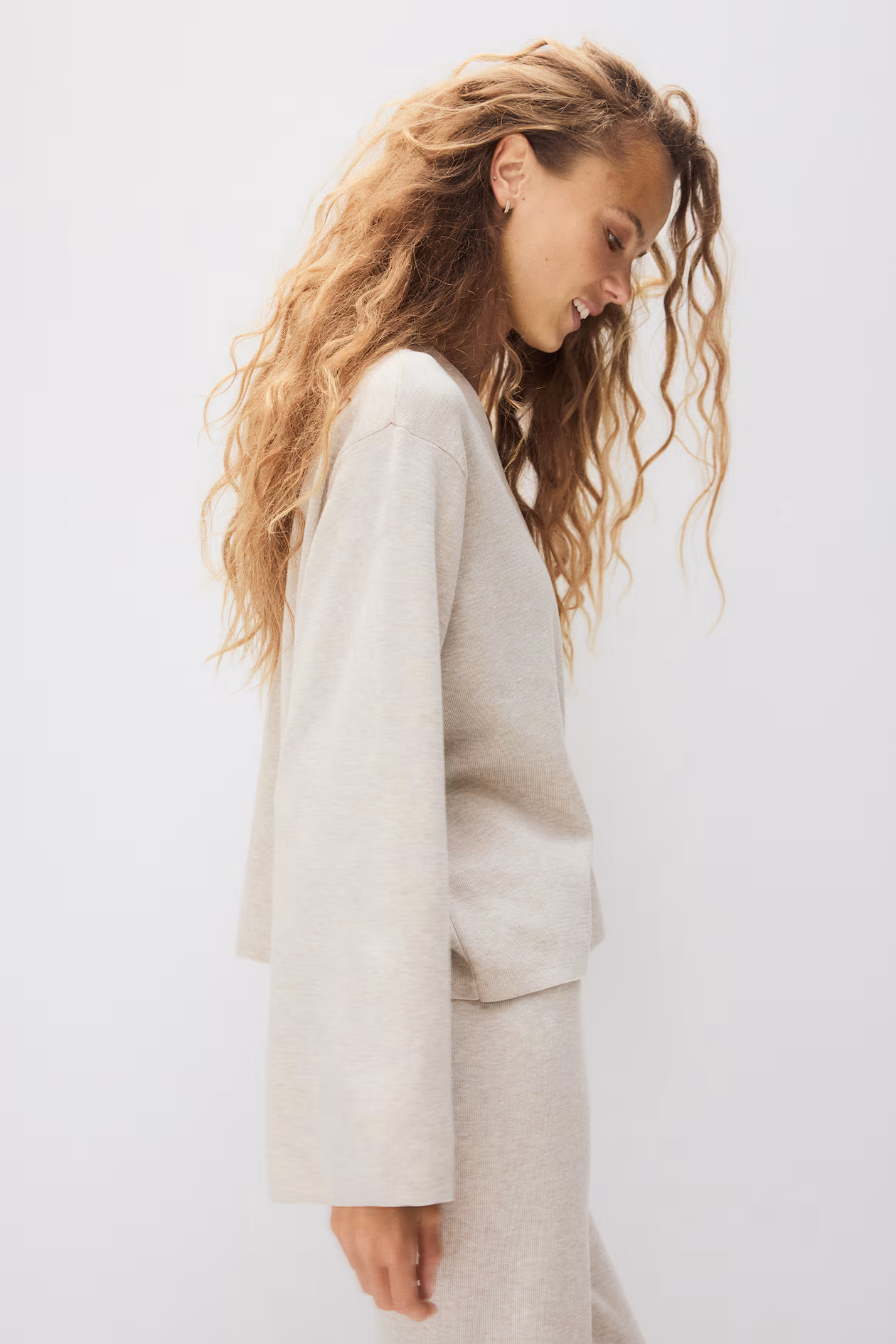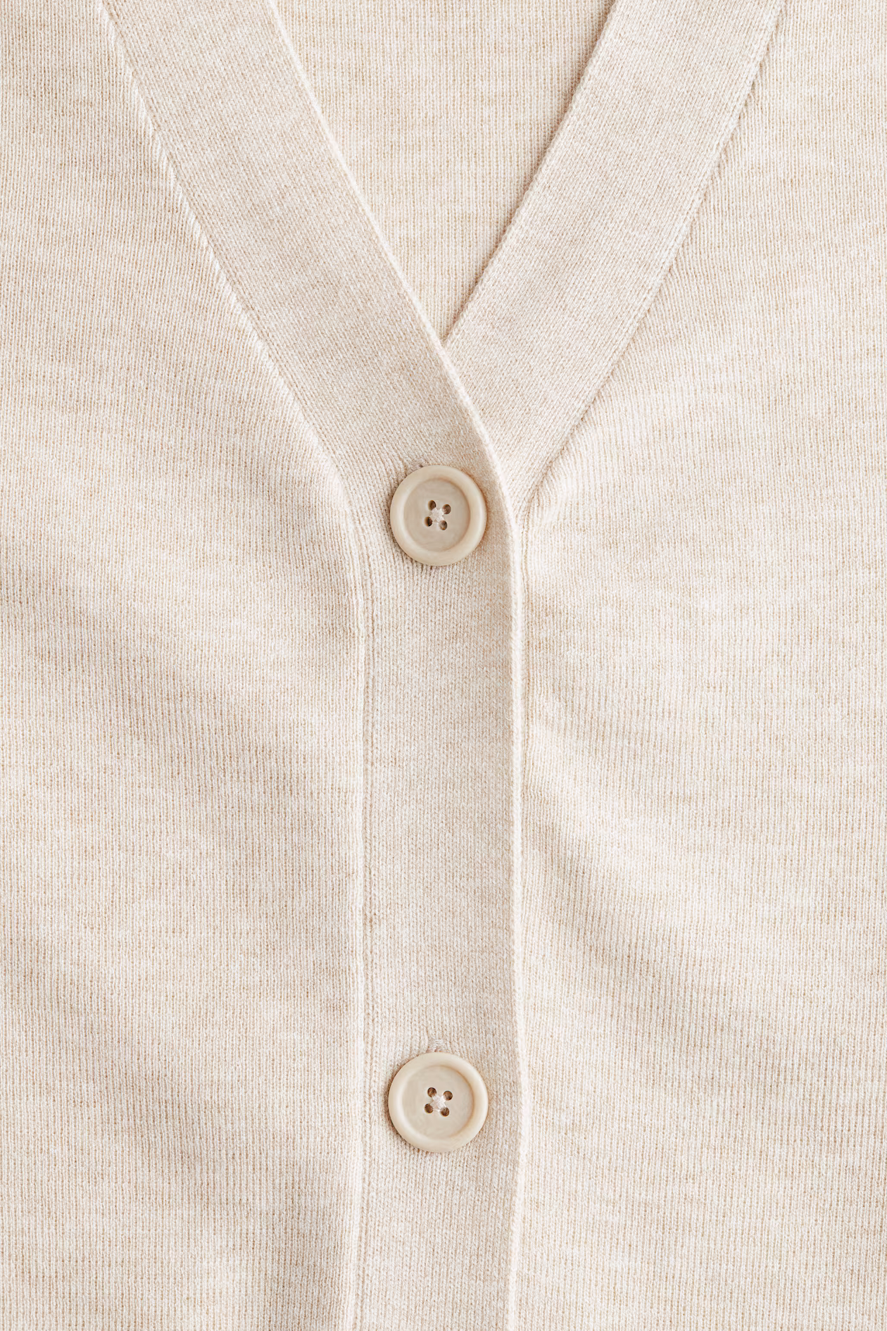 Cardigan in a soft, fine knit. Low-cut V-neck, buttons at front, dropped shoulders, and long sleeves. Ribbing at cuffs and hem.