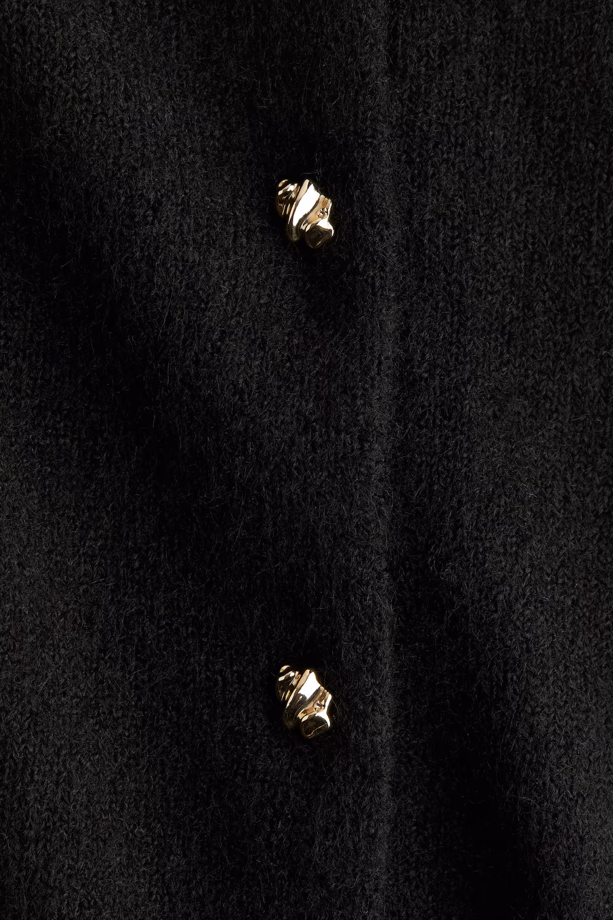 Soft, fine-knit cardigan with wool content. Round neckline, metal buttons at front, and narrow ribbing at neckline, cuffs, and hem.