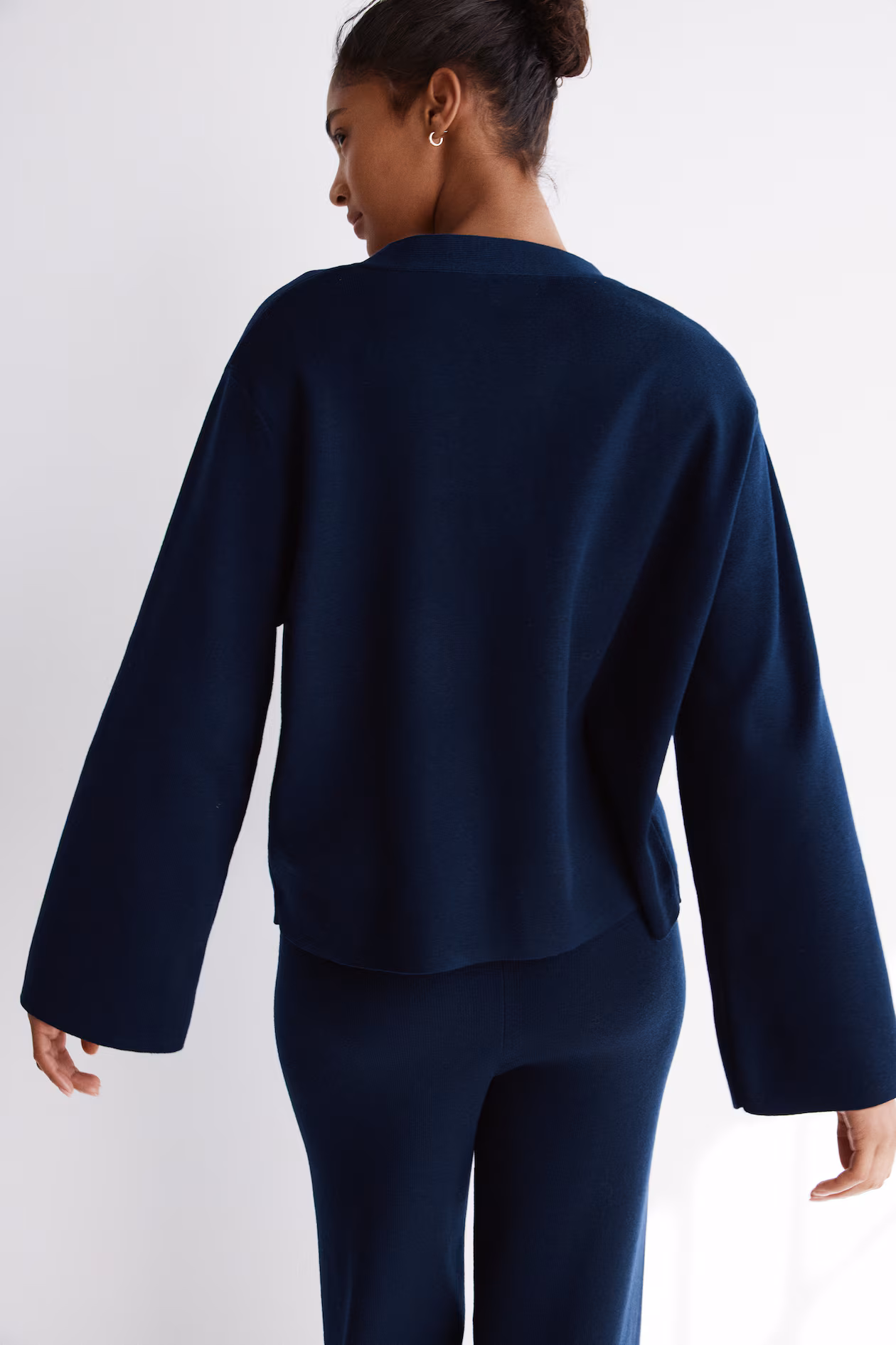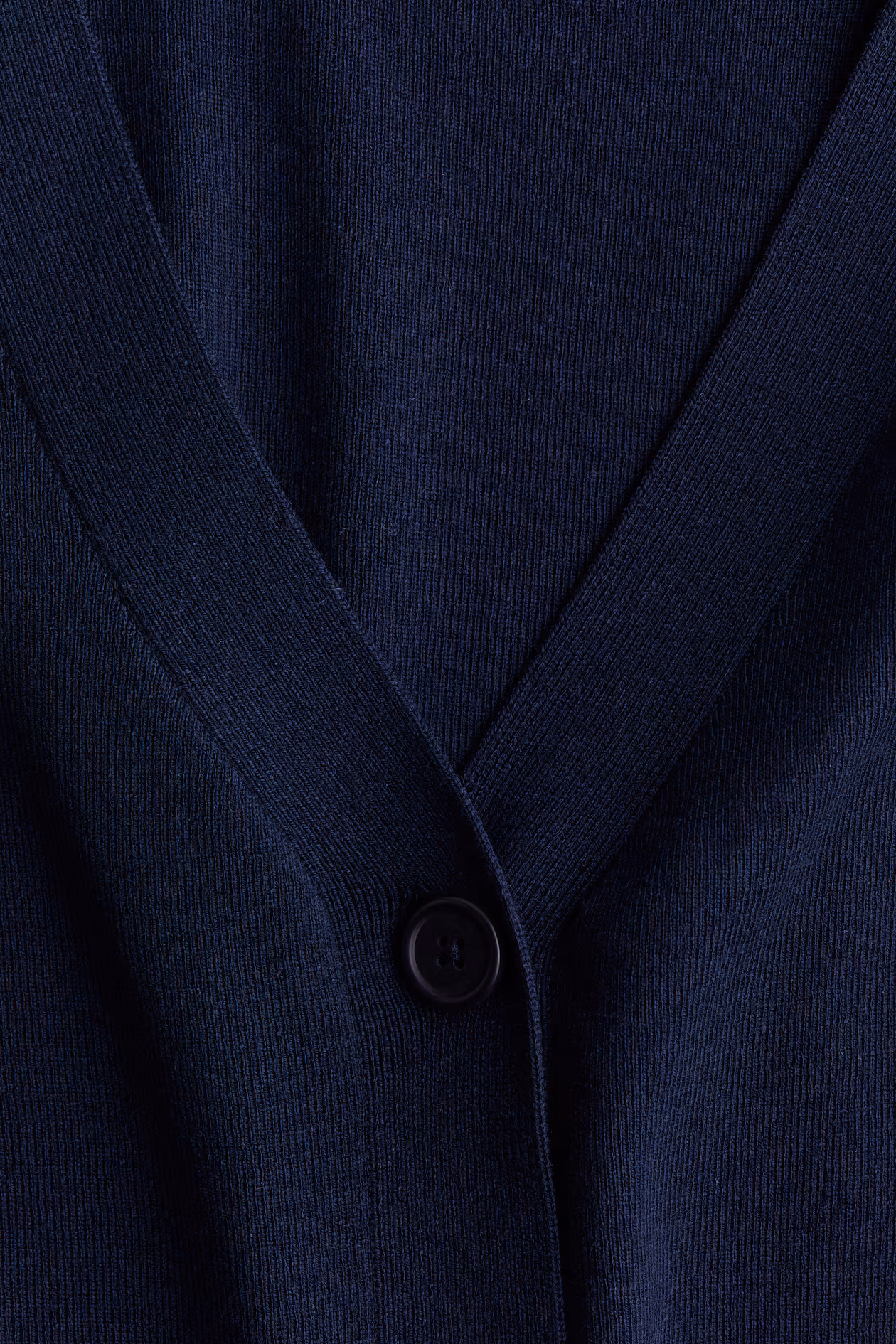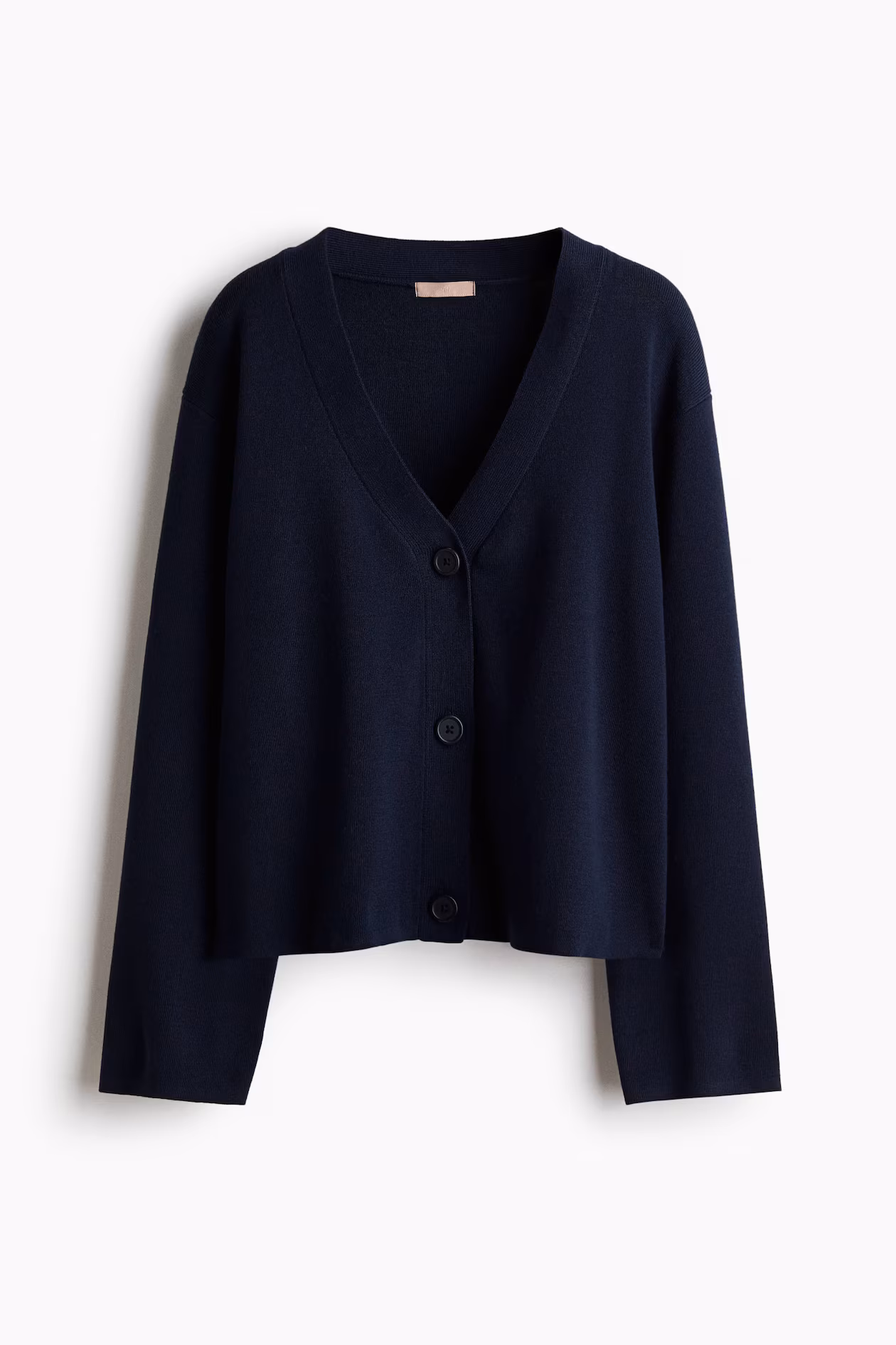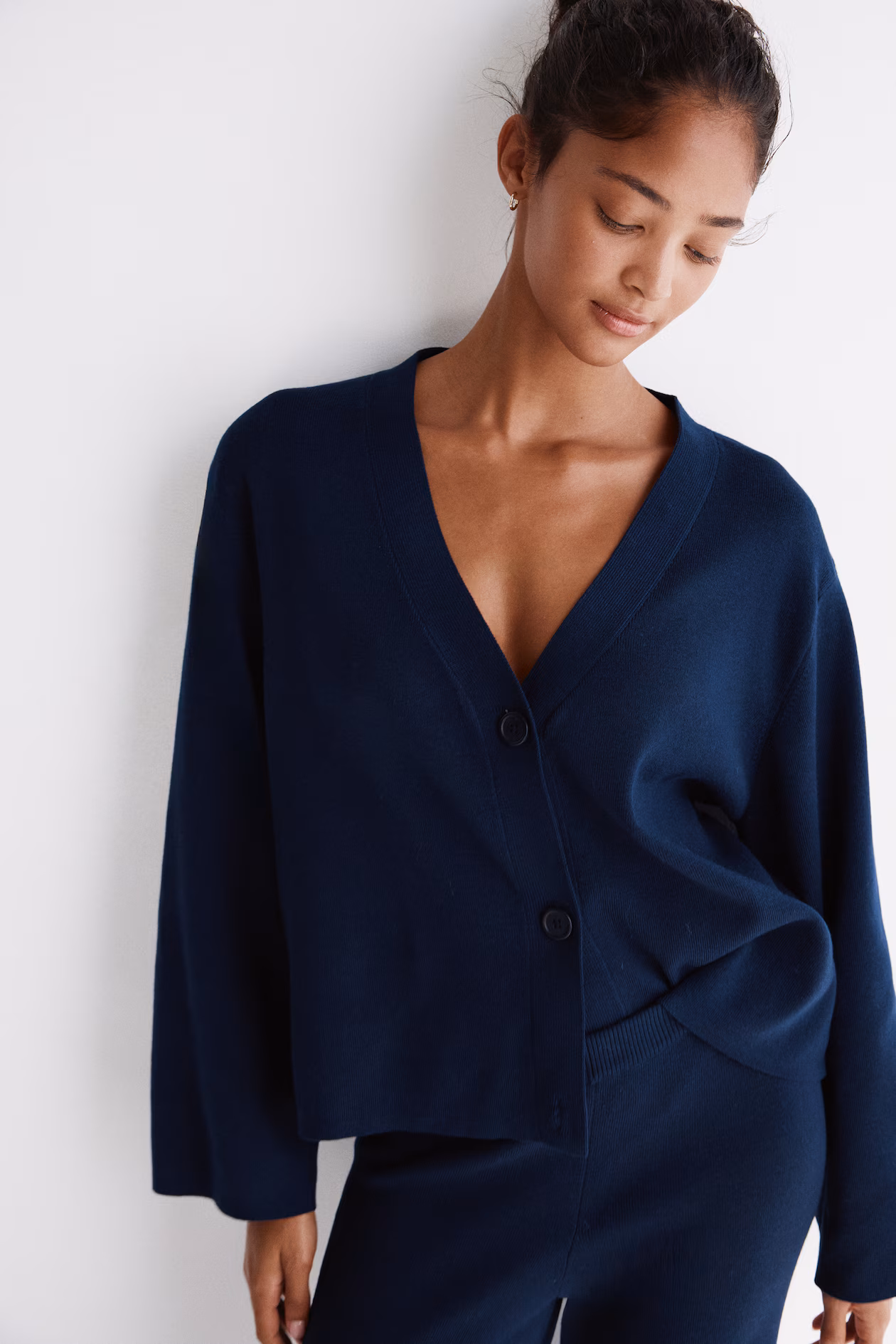 Cardigan in a soft, fine knit. Low-cut V-neck, buttons at front, dropped shoulders, and long sleeves. Ribbing at cuffs and hem.