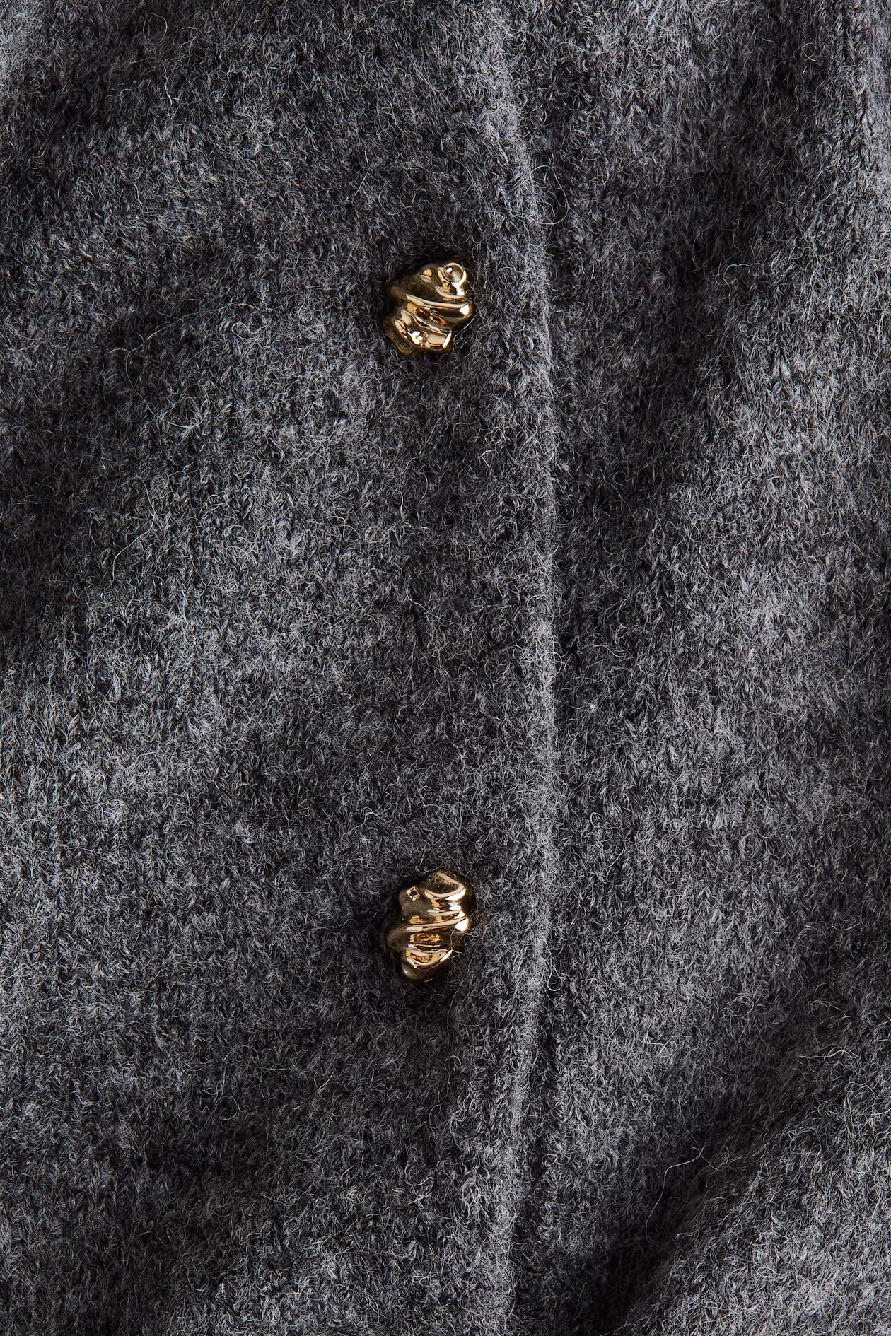 Soft, fine-knit cardigan with wool content. Round neckline, metal buttons at front, and narrow ribbing at neckline, cuffs, and hem.