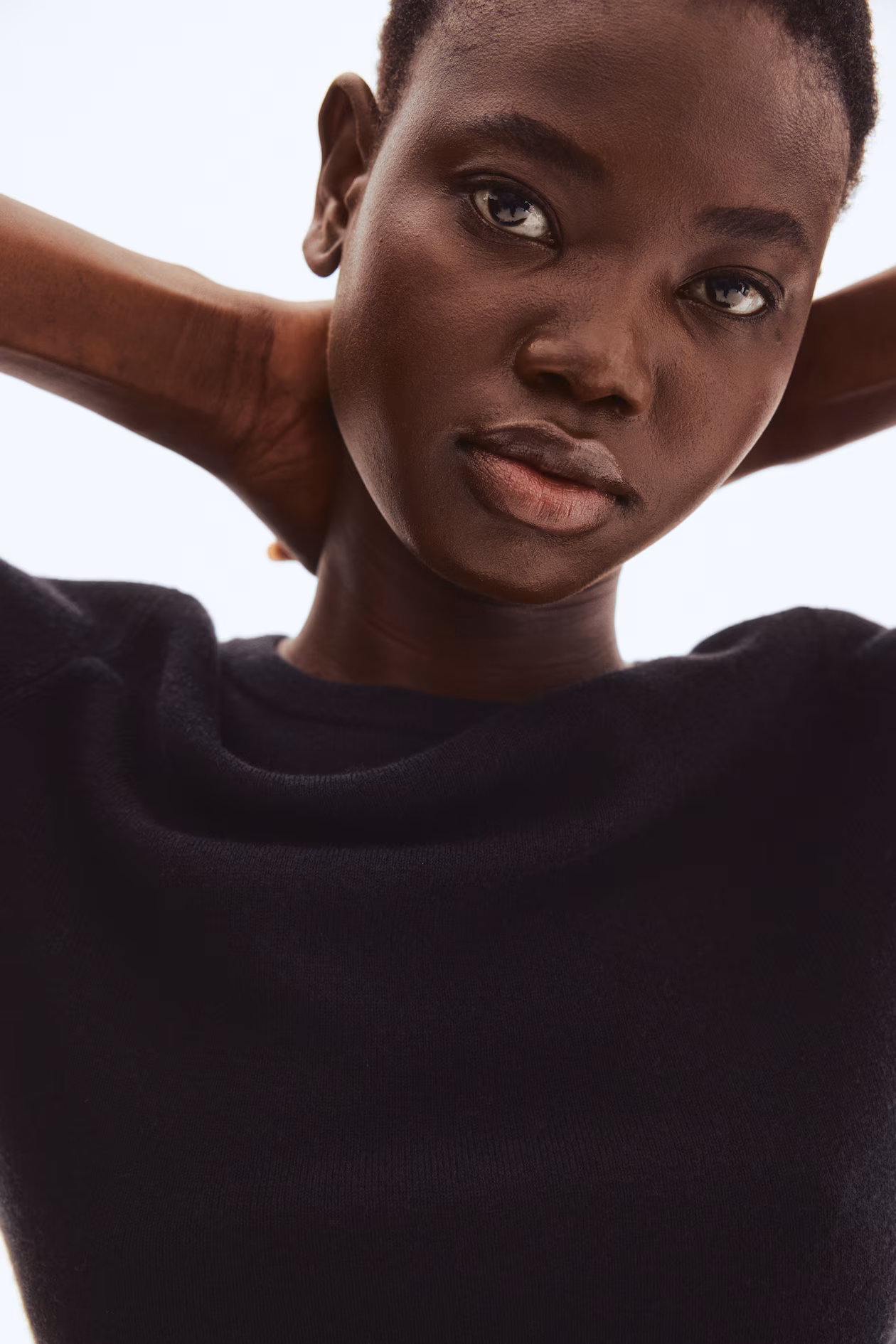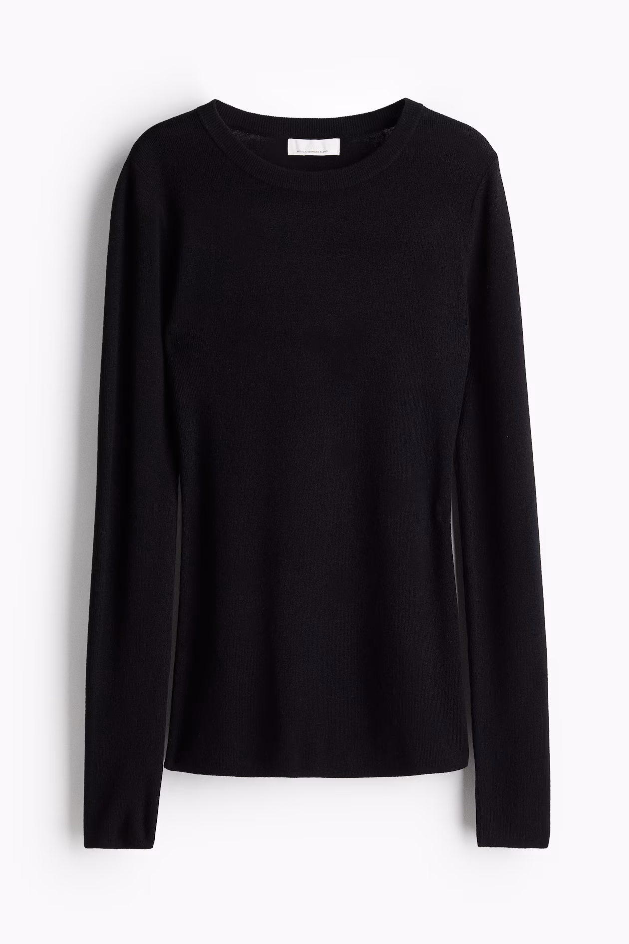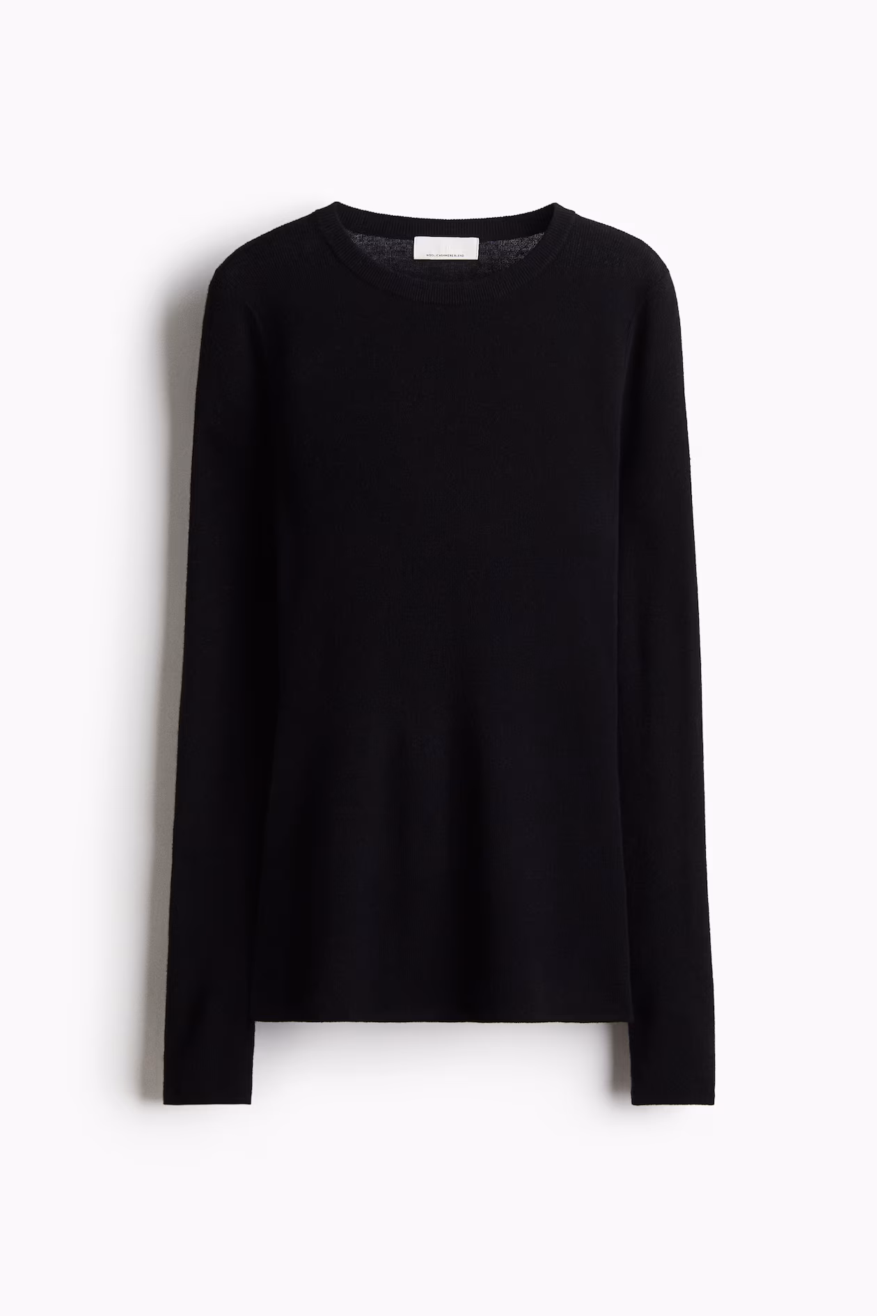 Slightly longer, fitted top in a soft, fine knit made from a wool and cashmere blend. Round, ribbed neckline and long sleeves.