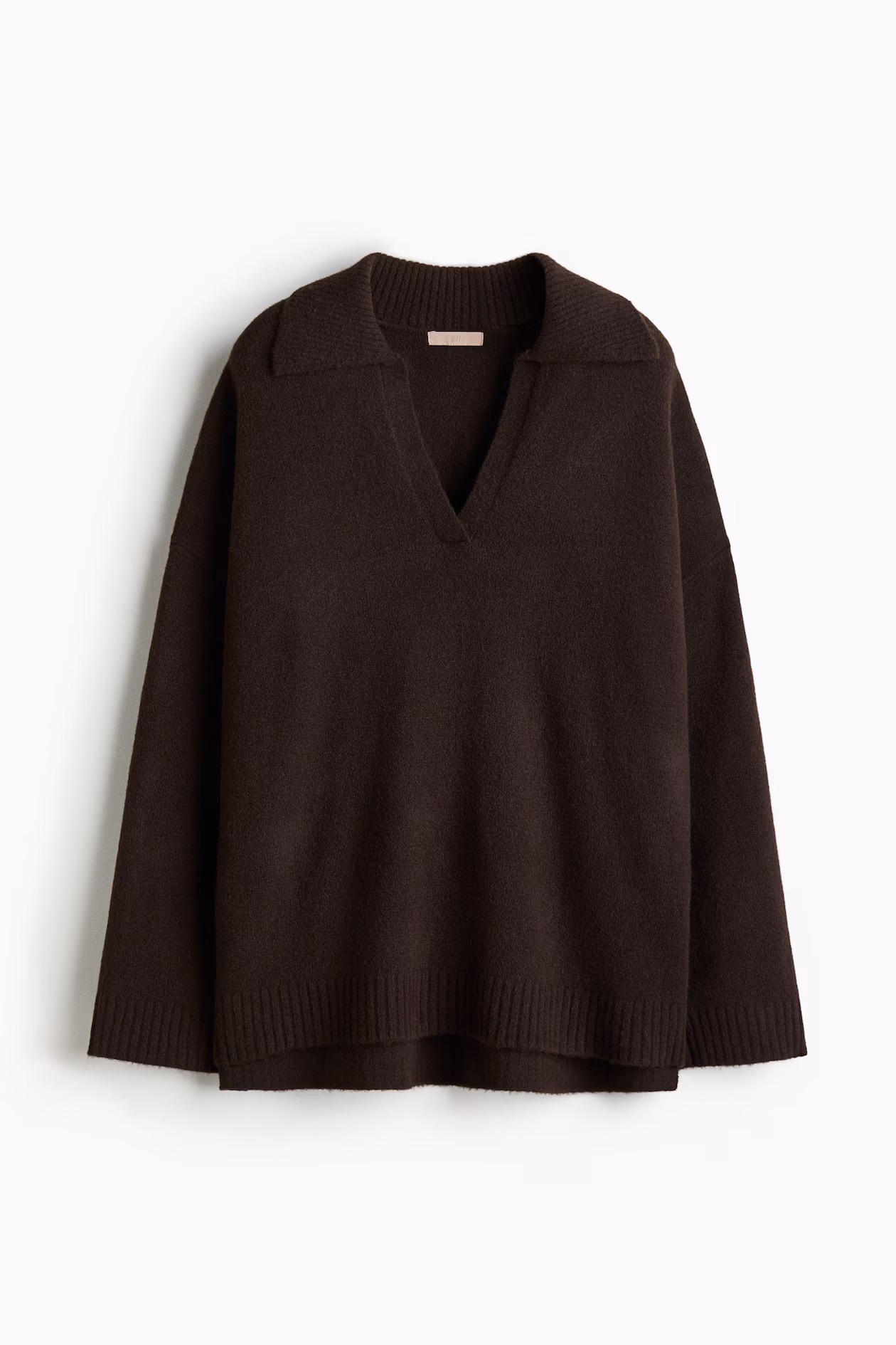 Slightly longer, loose-fit jumper in a soft, fine knit with a ribbed collar and V-shaped opening at the top. Dropped shoulders and long sleeves with ribbed cuffs. Straight, ribbed hem with a slit at each side. Longer at the back.