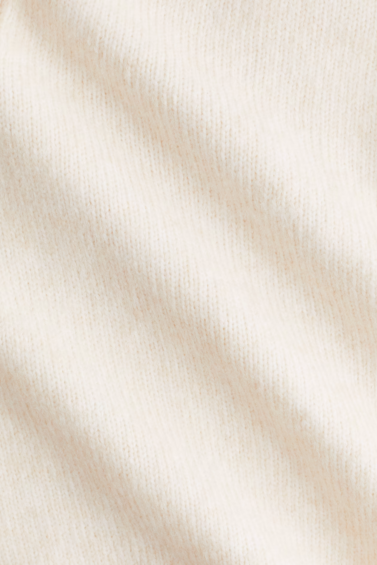 Soft, fine knit sweater. Rib-knit collar, V-neck opening at top, dropped shoulders, and long sleeves. Ribbing at cuffs and hem.