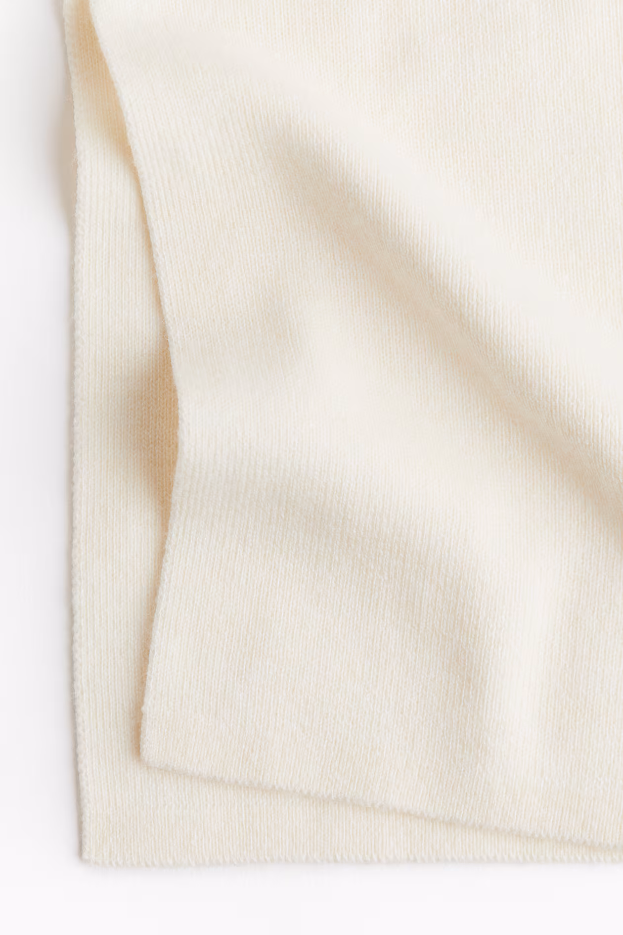 Fitted pants in a soft, fine knit. Covered elastic at waistband and flared hems with a slit at one side.