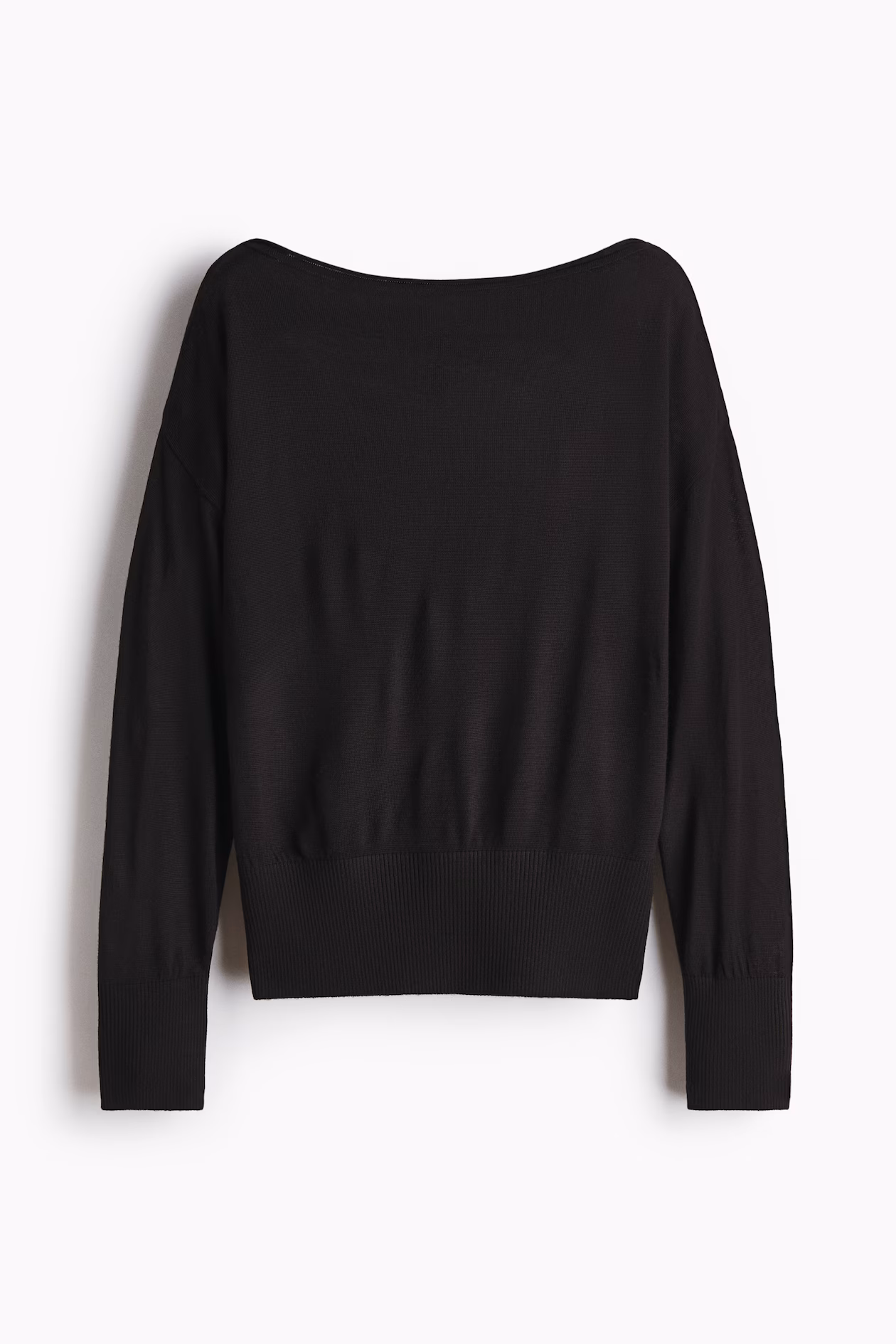 One-shoulder top in a sheer, fine knit. Wide, rolled-edge boat neck, dropped shoulders, and long sleeves. Gathers and wide ribbing at cuffs and hem.