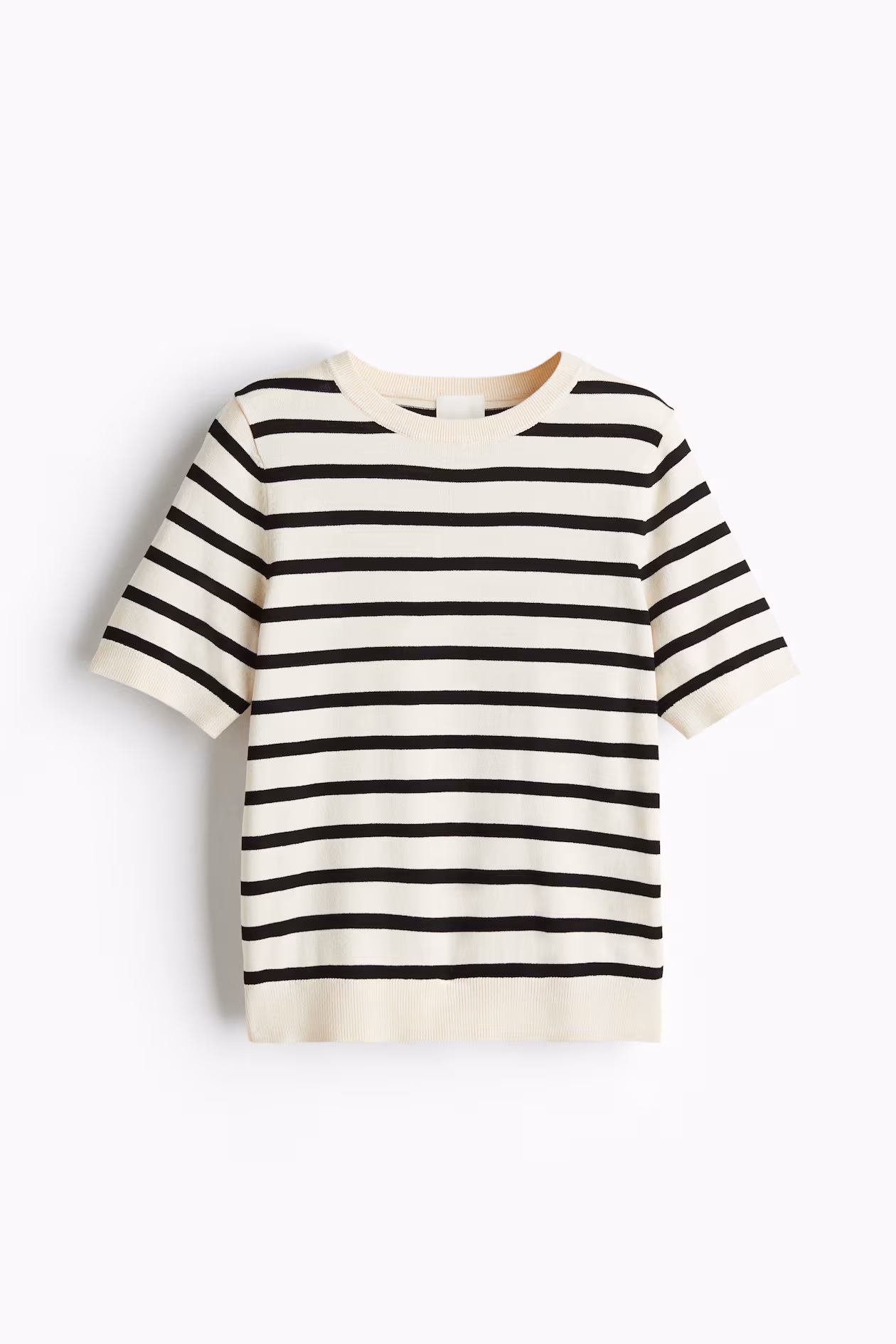 Short-sleeved top in a fine-knit viscose blend. Ribbing at neckline, cuffs, and hem.