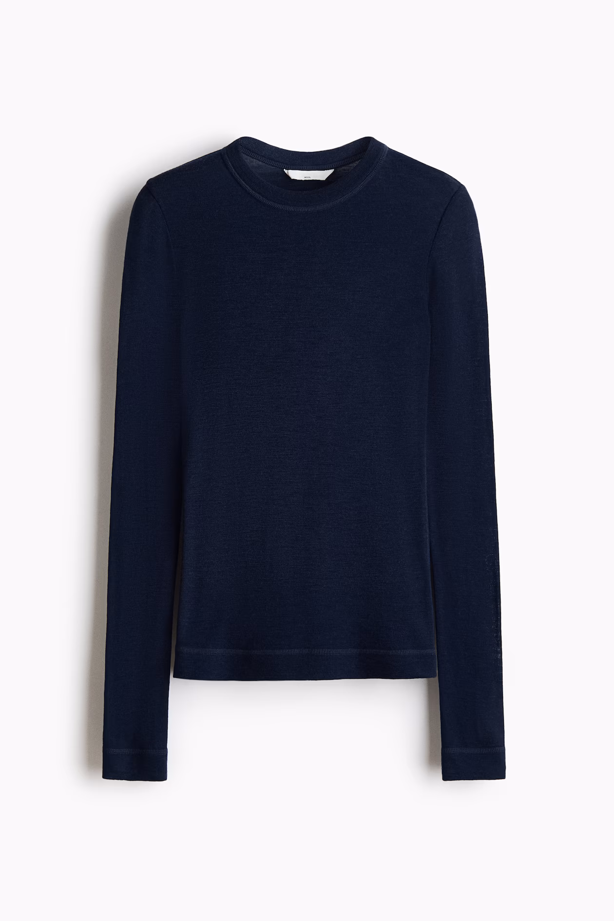 Fitted, fine-knit top in sheer wool with non-chafe flatlock seams. Round, ribbed neckline and extra-long sleeves.