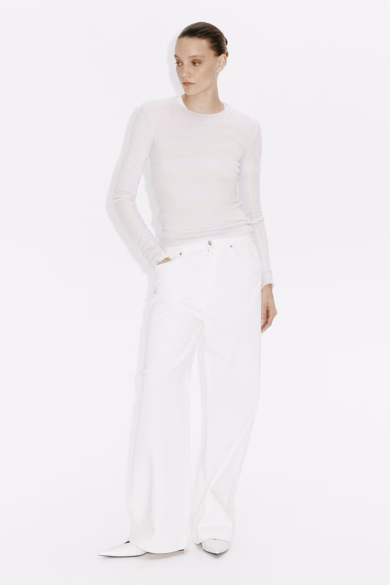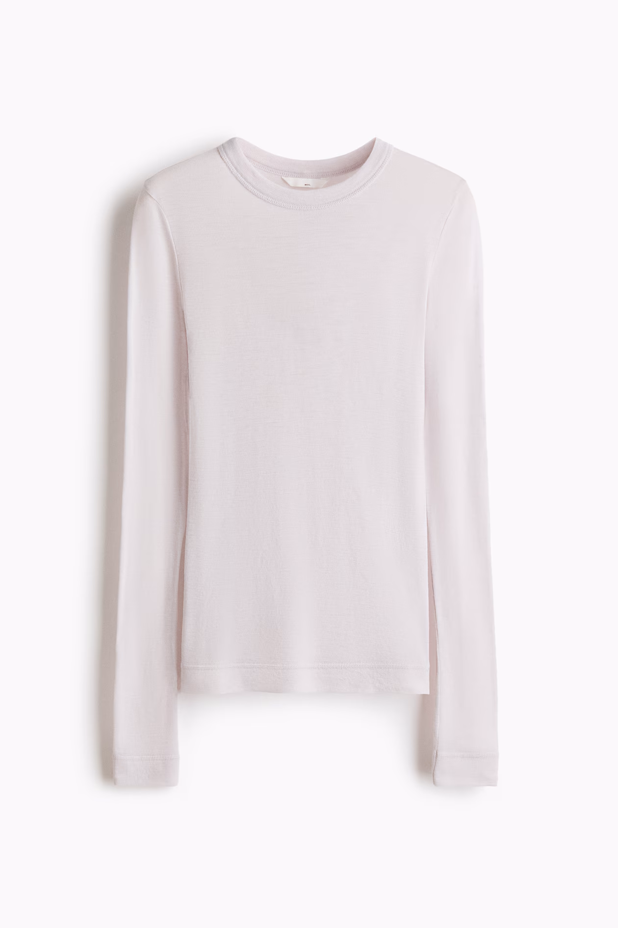 Fitted, fine-knit top in sheer wool with non-chafe flatlock seams. Round, ribbed neckline and extra-long sleeves.