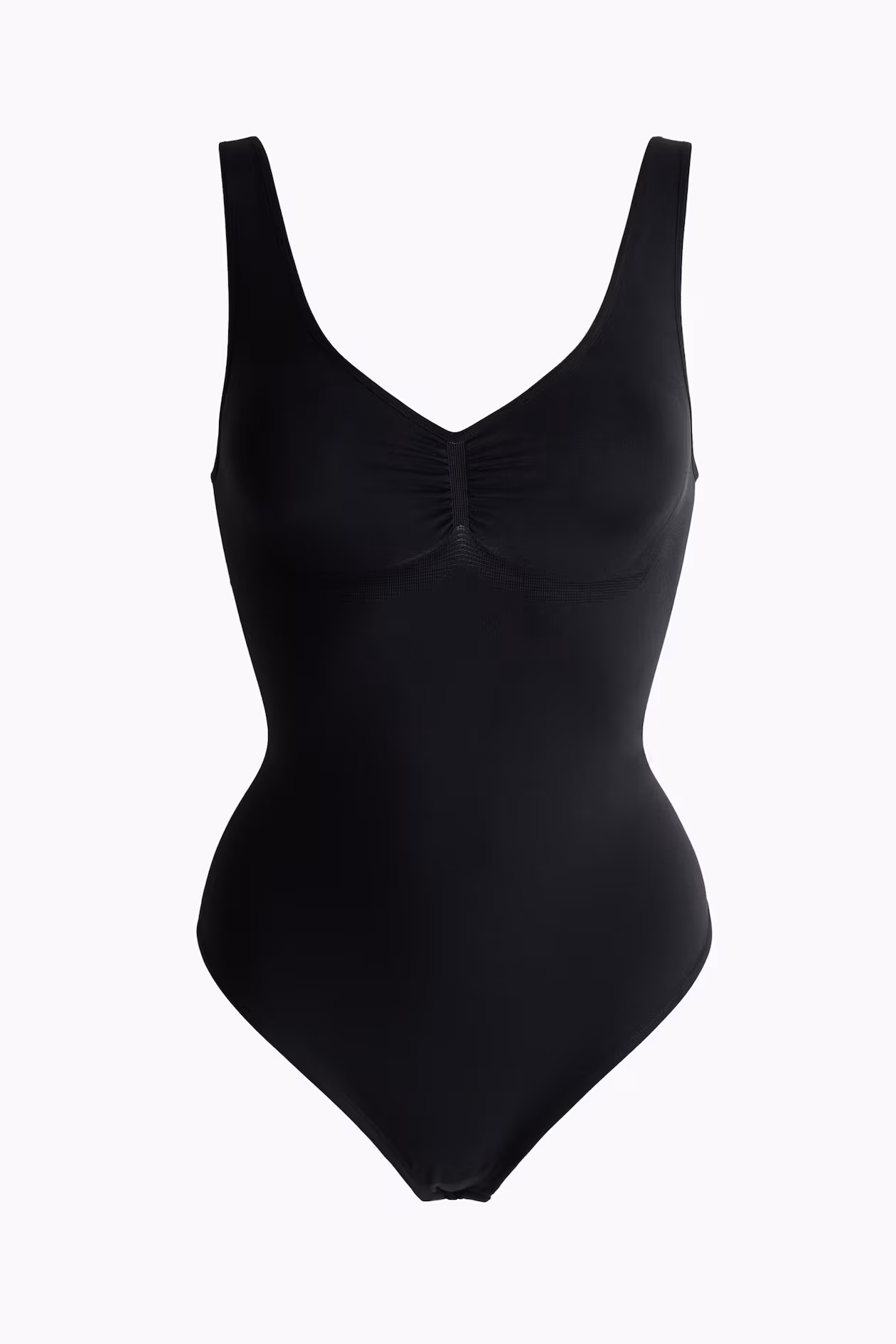 Thong bodysuit with a firm sculpting effect on tummy. Wide shoulder straps, lined, soft cups with a fully fashioned section to enhance bust and provide light support, and lined gusset with concealed snap fasteners. Designed with minimal seams for seamless comfort on skin.