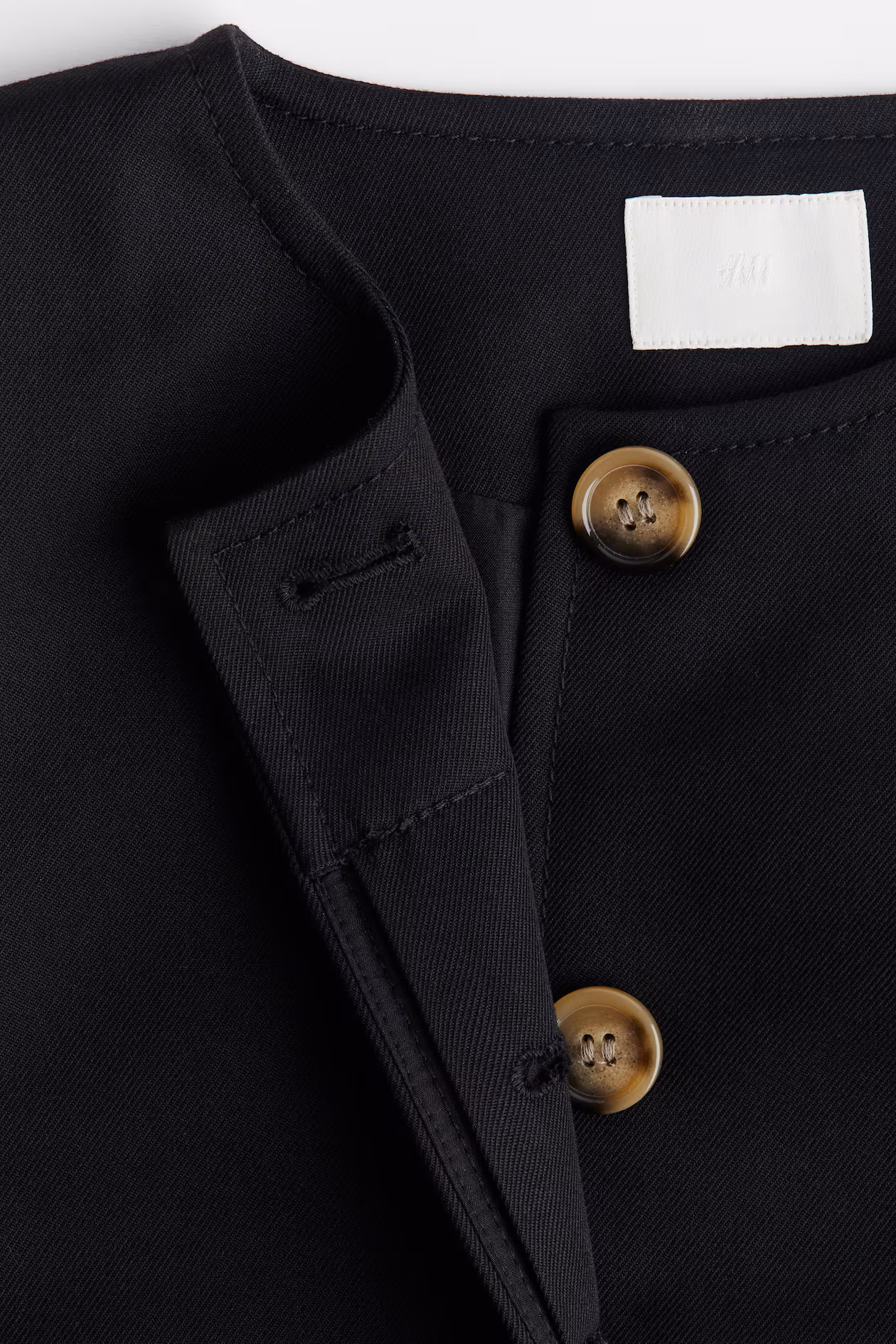 Fitted jacket in woven fabric with shaping darts at waist for a figure-hugging silhouette. Round neckline, buttons to waist, and patch front pockets. Shoulder pads and sleeves with slit at cuffs. Lined.