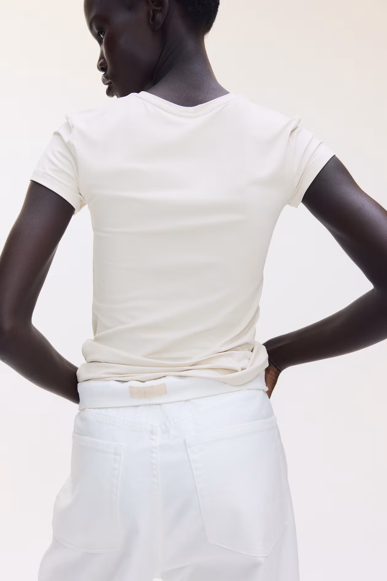 Fitted T-shirt in microfiber with narrow trim at neckline.