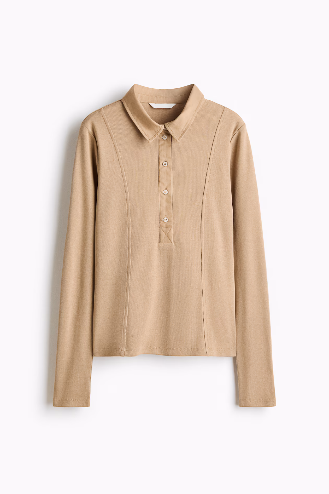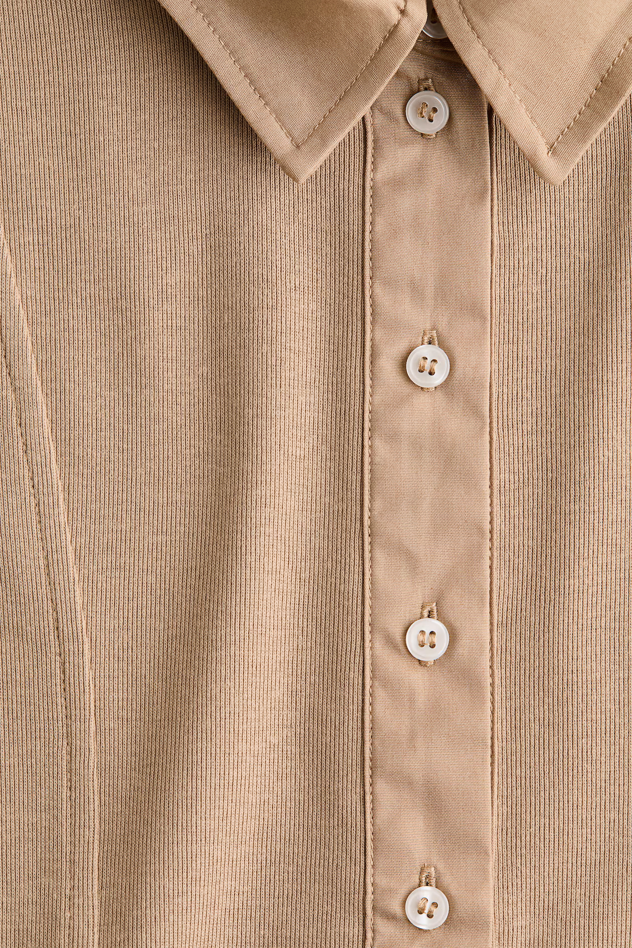 Fitted top in cotton jersey with collar and placket in woven fabric. Yoke at back, long sleeves, and shaping seams at front.