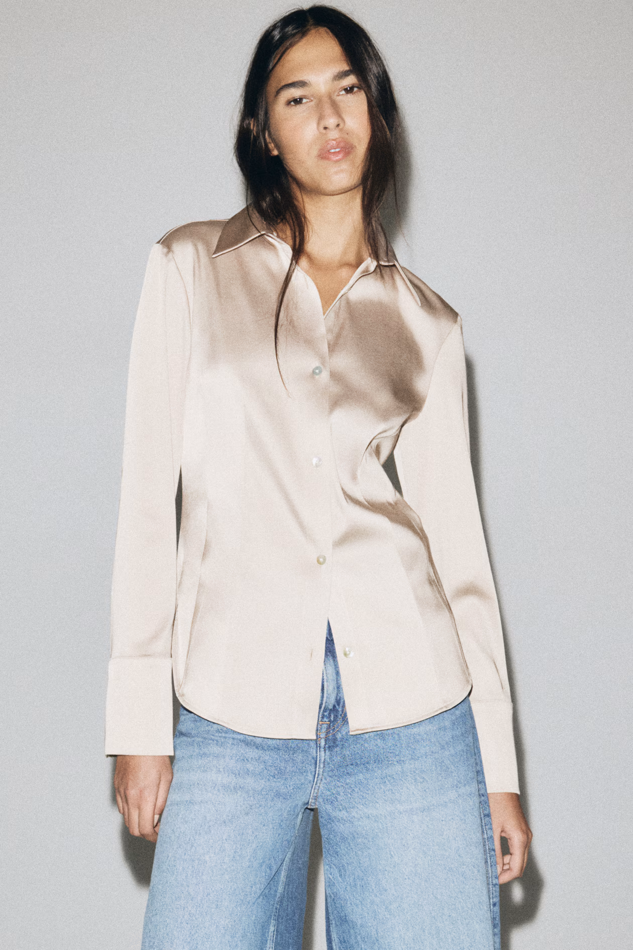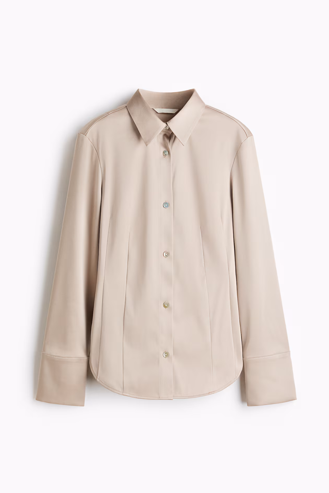 Fitted shirt in twill with a slight sheen. Collar, buttons at front, and long sleeves with slit and button at cuffs. Shaping seams at front and back for a flattering silhouette.