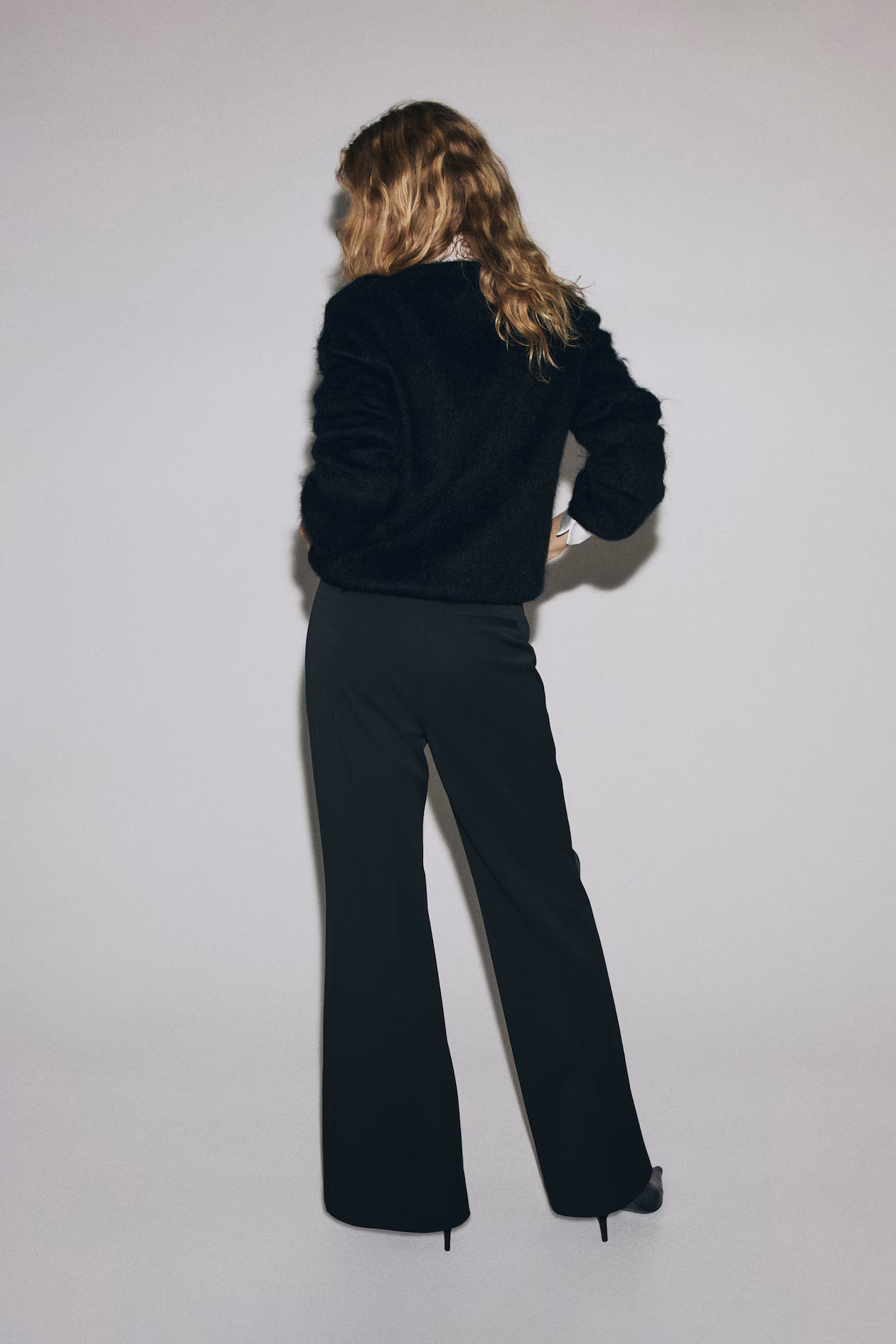 Pants in woven fabric. High waist, a narrow, coated belt, and zip fly with concealed hook-and-bar fasteners. Patch front pockets, a mock welt back pocket, and flared legs with creases at front and back.