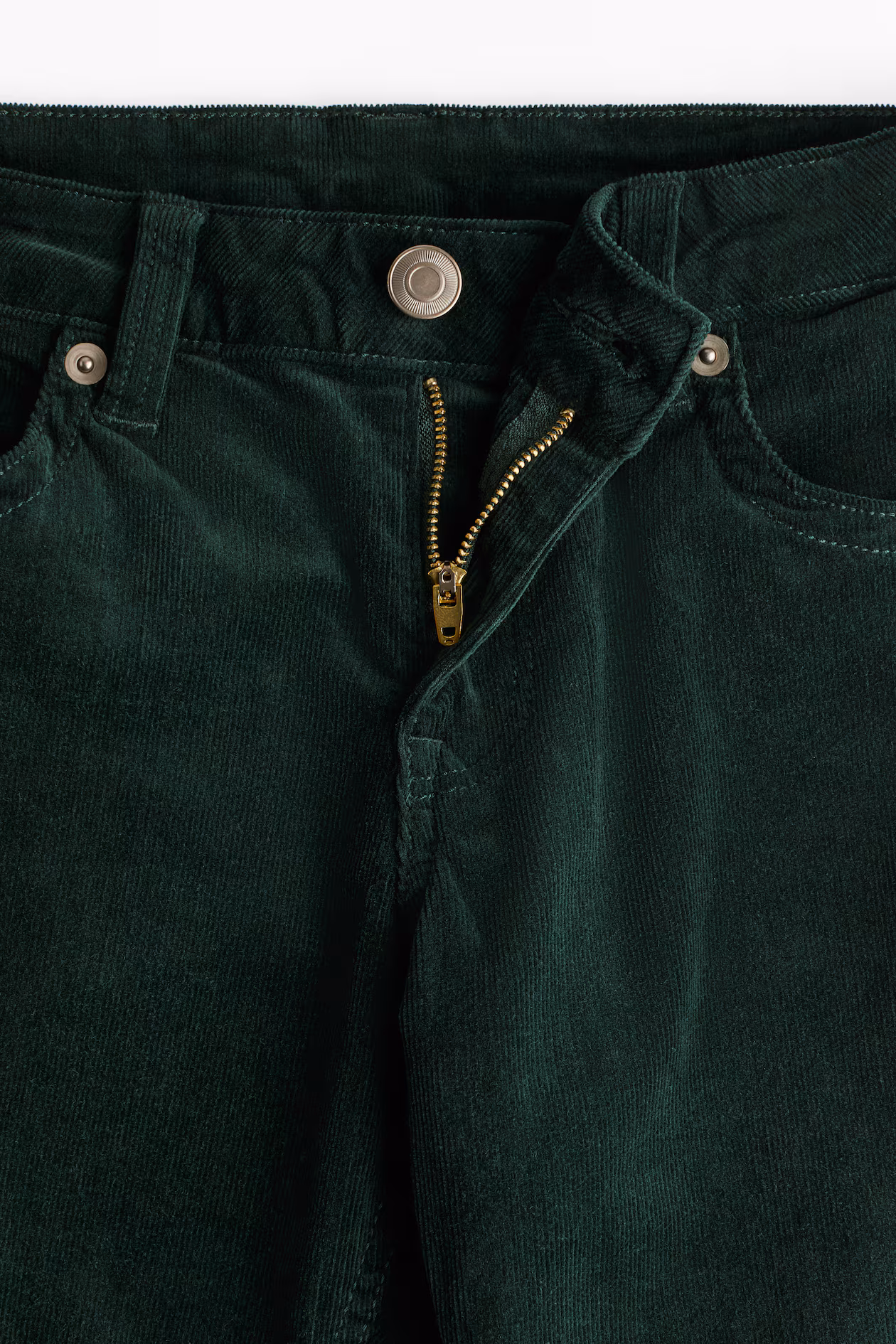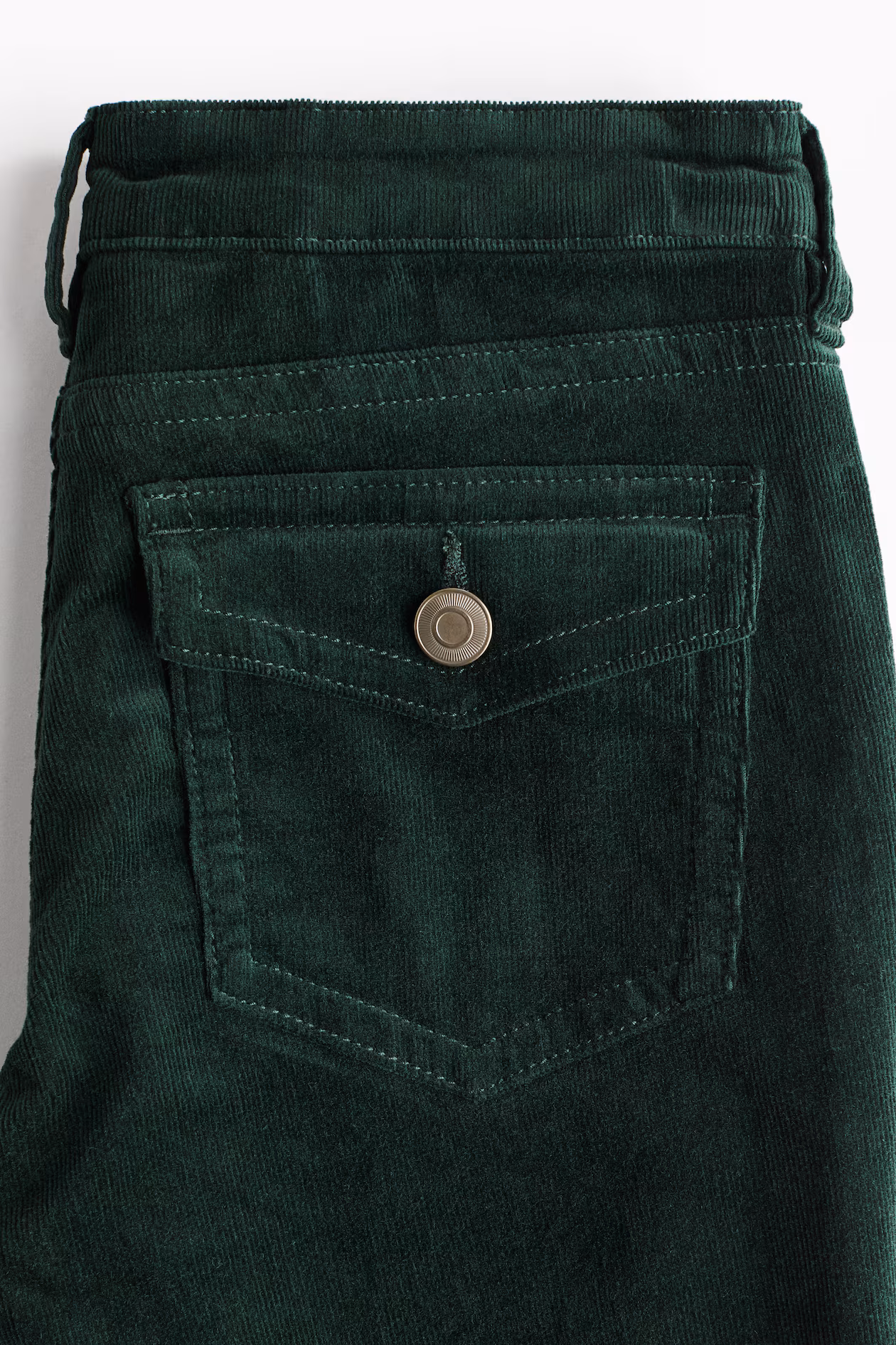 Pants in soft cotton corduroy with a slim fit from waist to thigh and a flared cut from knee to hem. Low waist, zip fly with button, open front pockets, and back pockets with flap and button. Flared, longer legs, designed to fall over foot with a stacking effect.