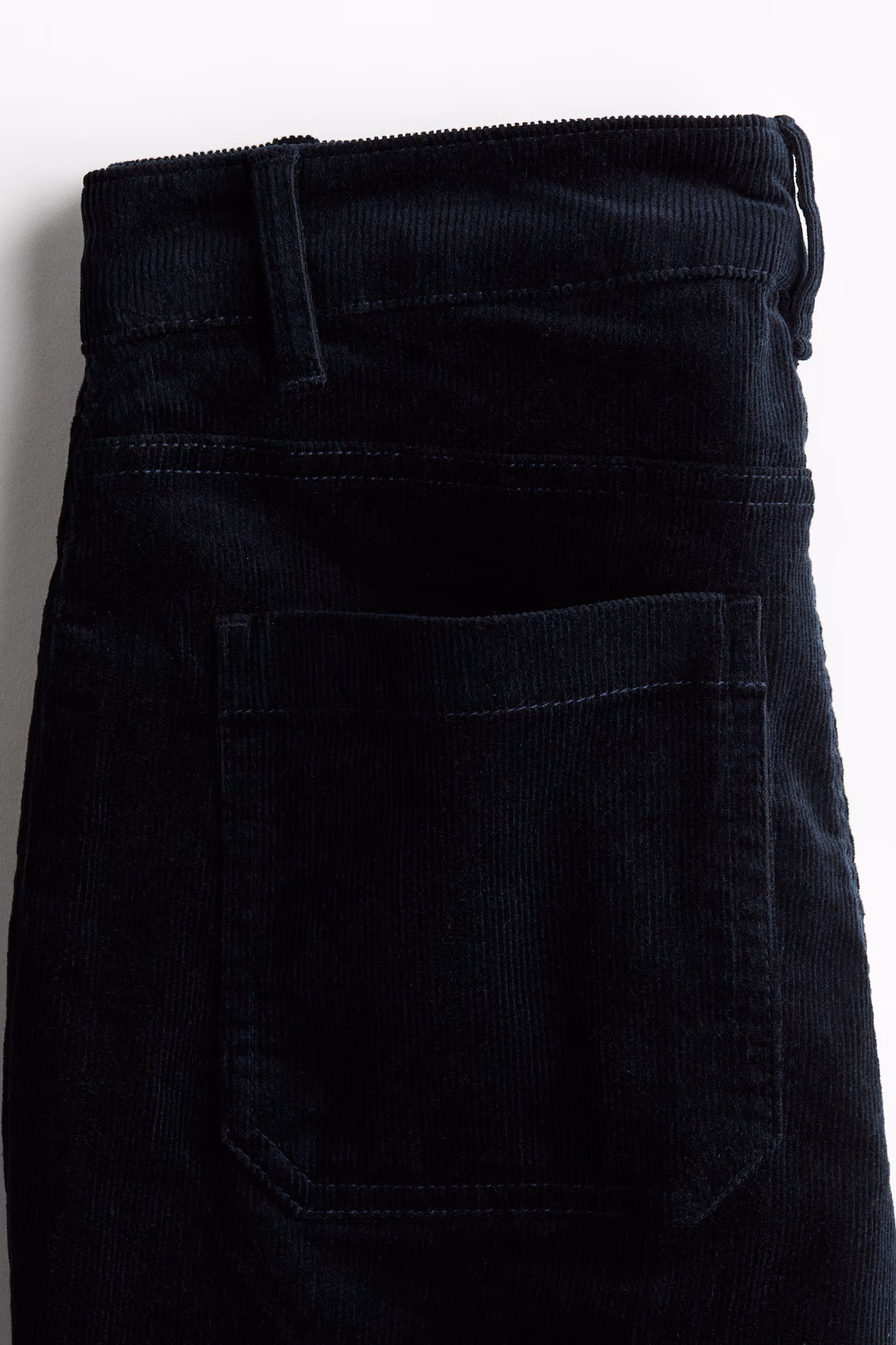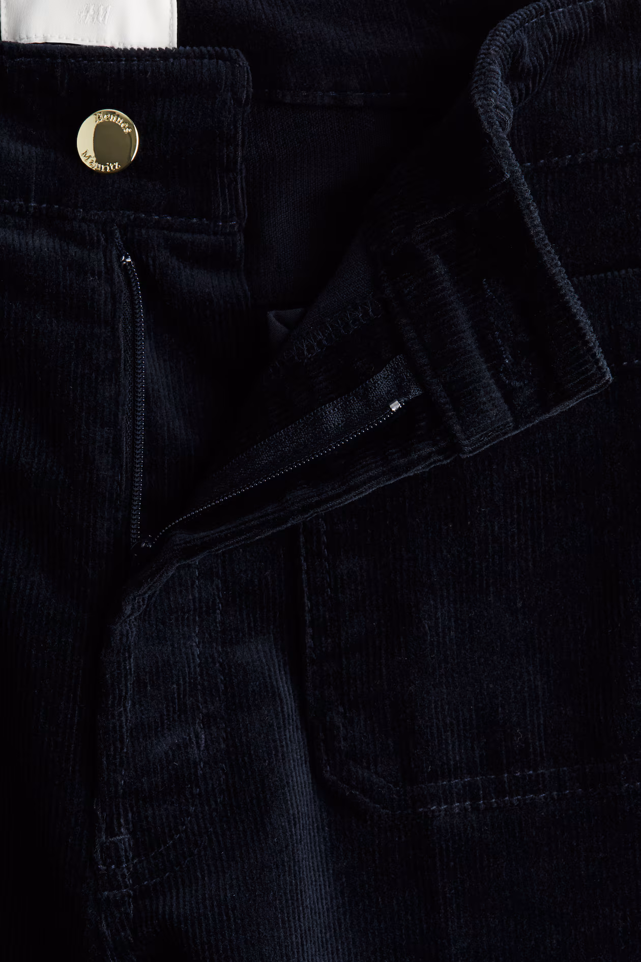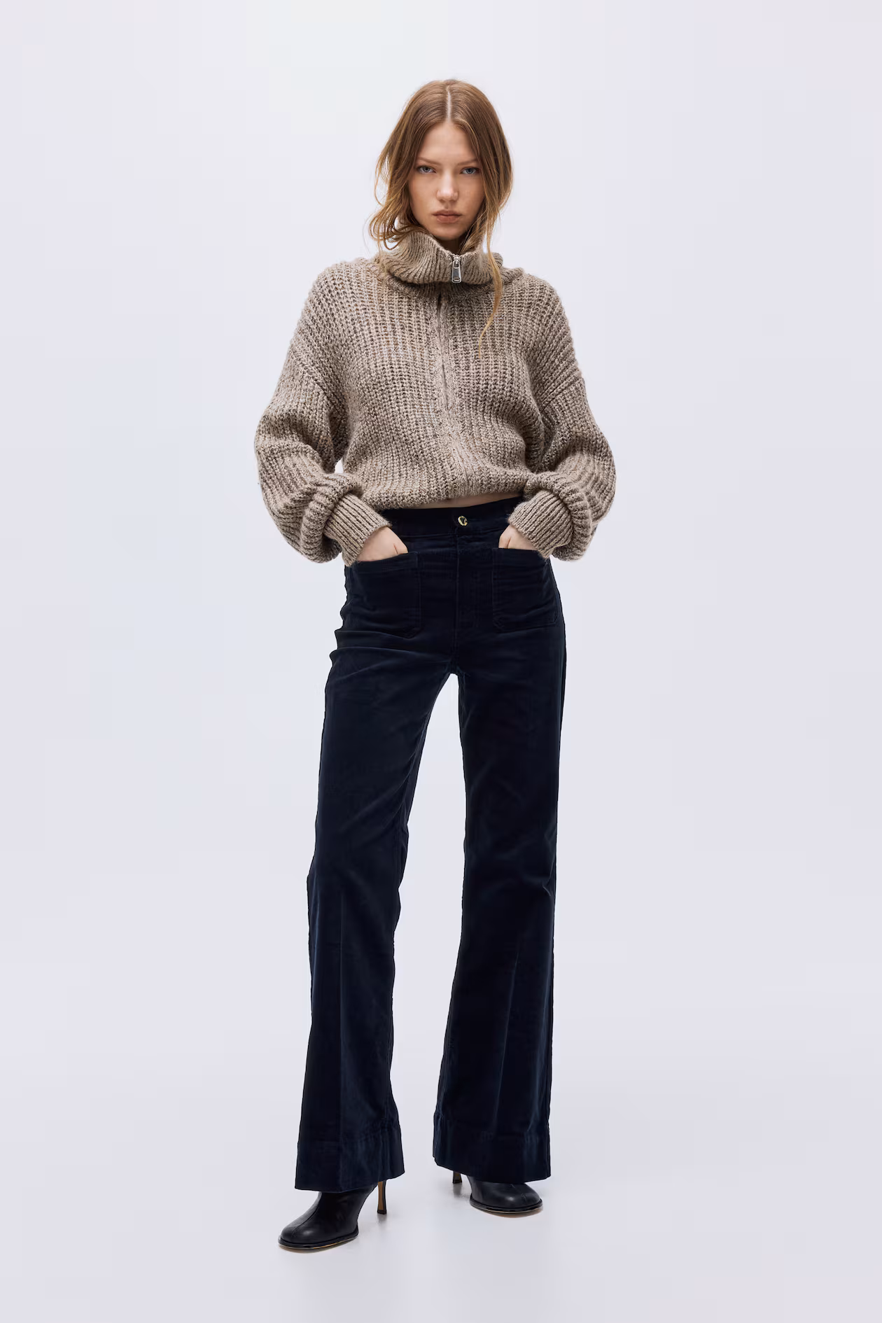 Pants in cotton corduroy with creases at front and back. High waist, zip fly with button, and patch pockets at front and back. Flared legs.