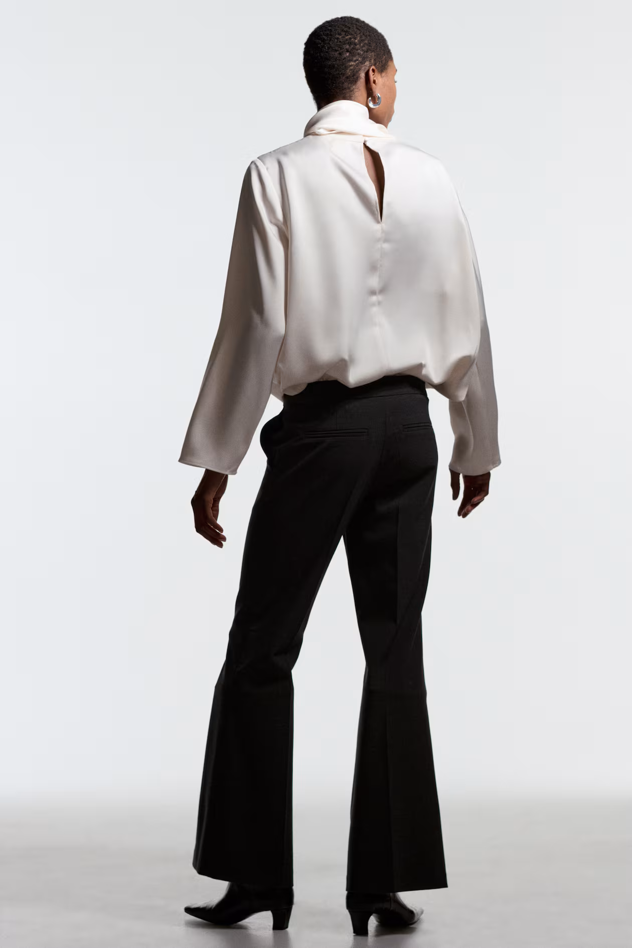Dress pants in woven fabric. Zip fly with concealed button and hook-and-bar fasteners, diagonal side pockets, and welt back pockets. Flared legs with creases at front and back.