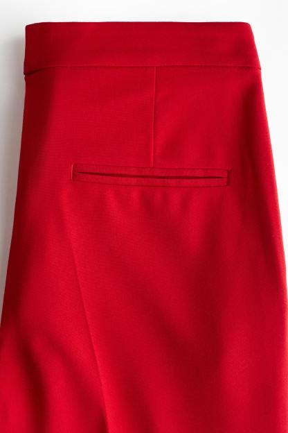 Fitted pants in woven fabric with creases at front and back. Regular waist and zip fly with concealed hook-and-bar fastener. Diagonal front pockets, welt back pockets, and flared hems.