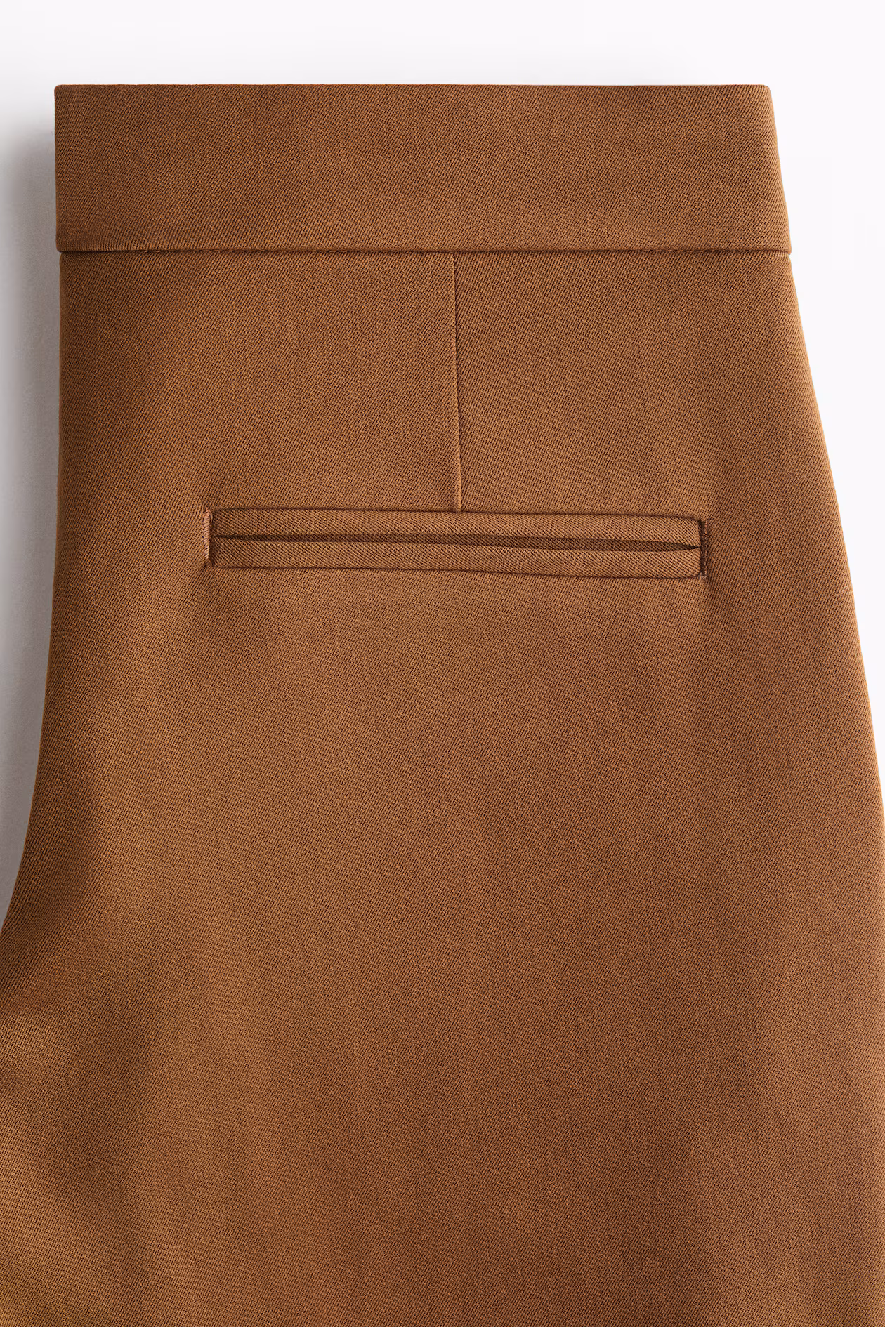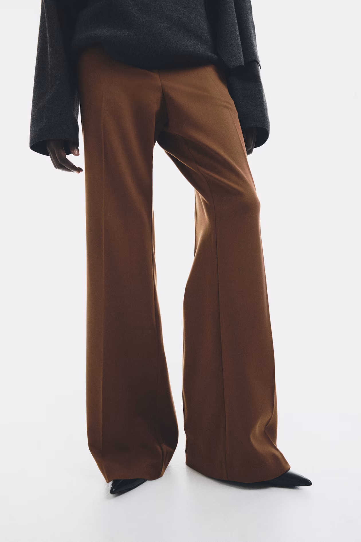 Dress pants in woven fabric. Zip fly with concealed button and hook-and-bar fasteners, diagonal side pockets, and welt back pockets. Flared legs with creases at front and back.