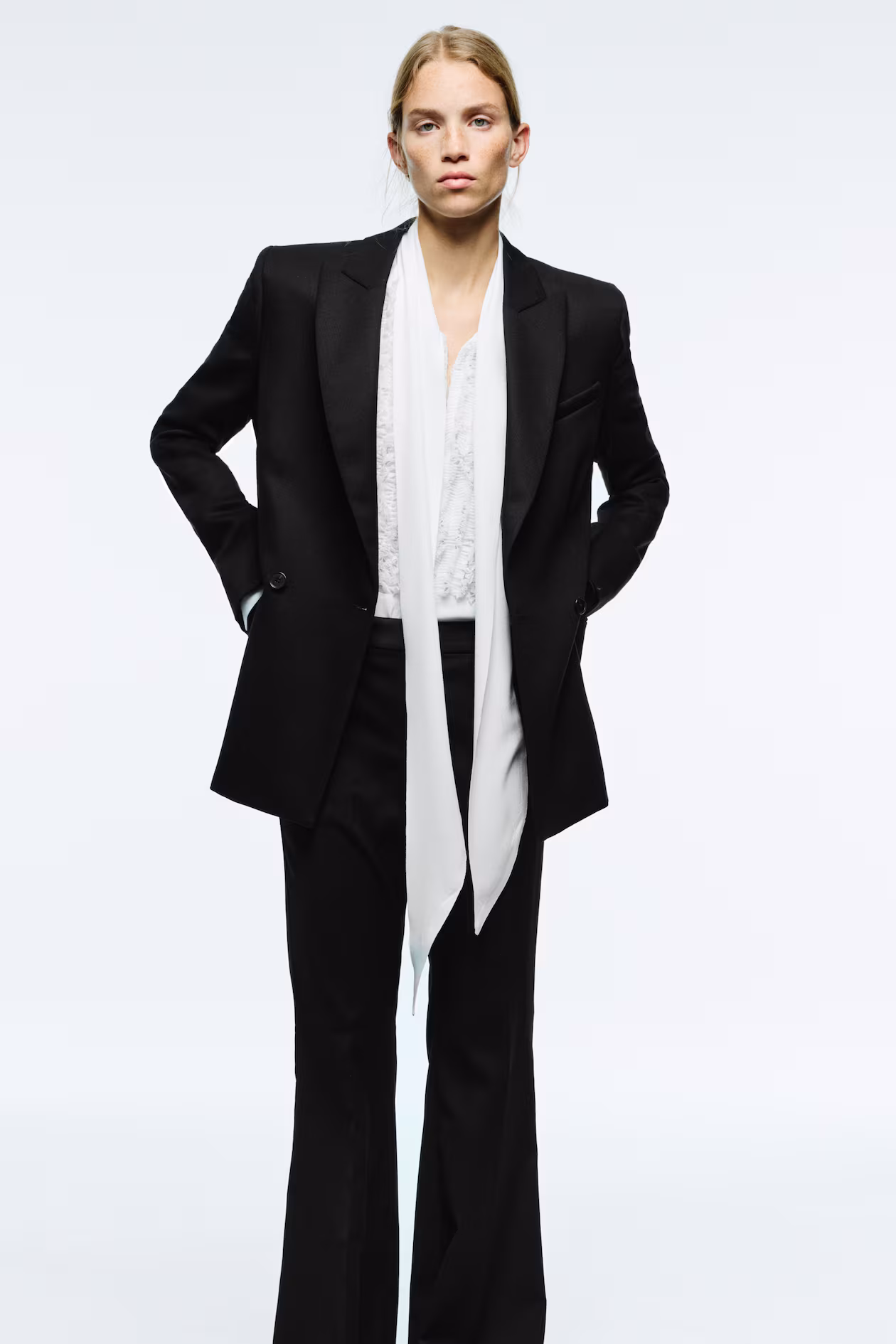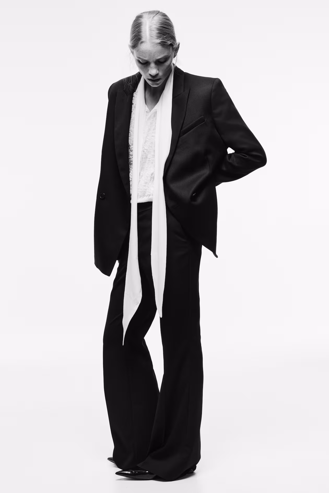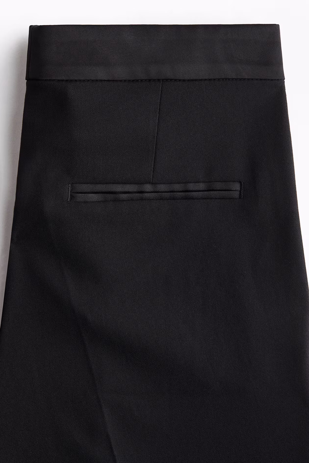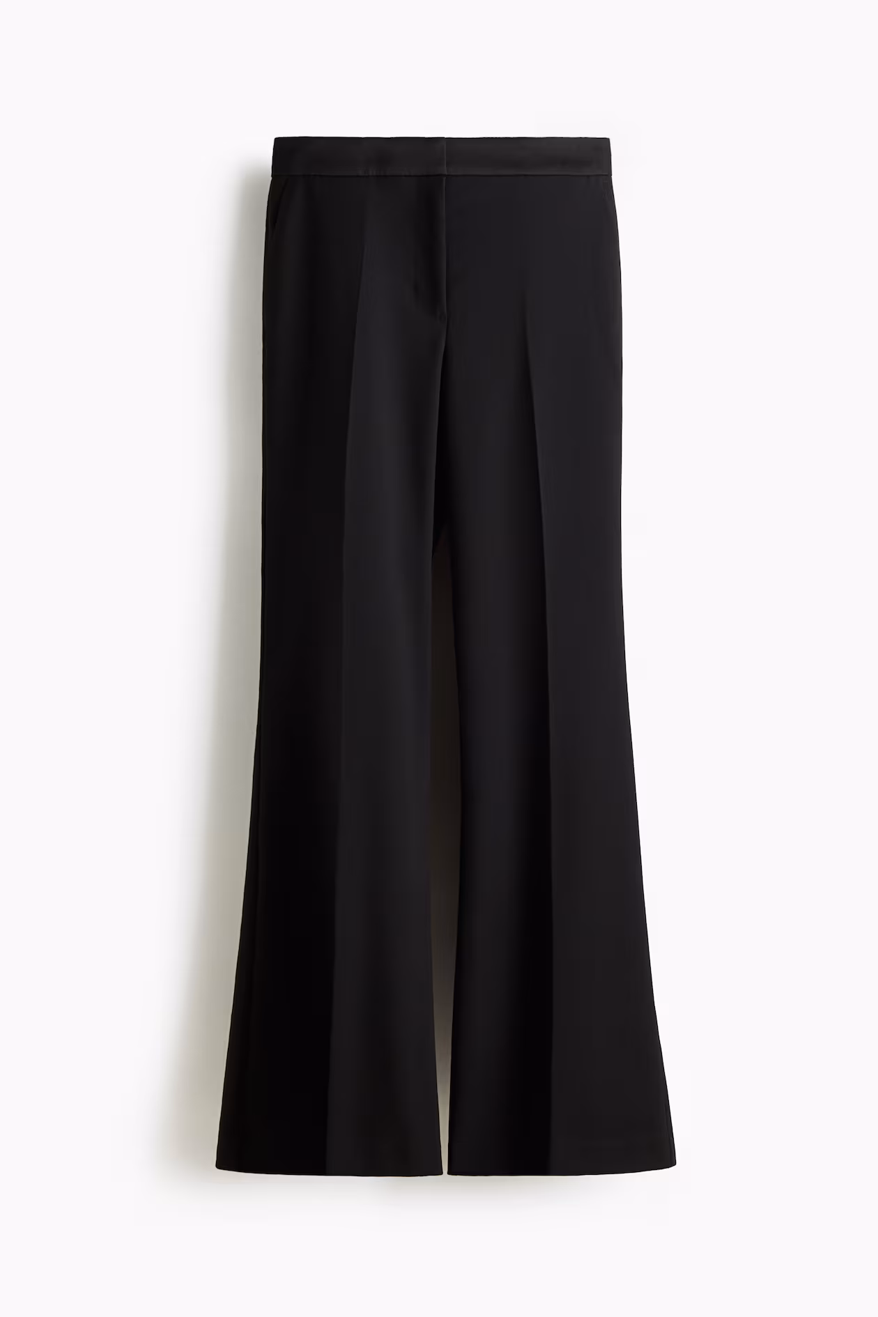 Fitted pants in woven fabric with creases at front and back. Regular waist and zip fly with concealed hook-and-bar fastener. Diagonal front pockets, welt back pockets, and flared hems.
