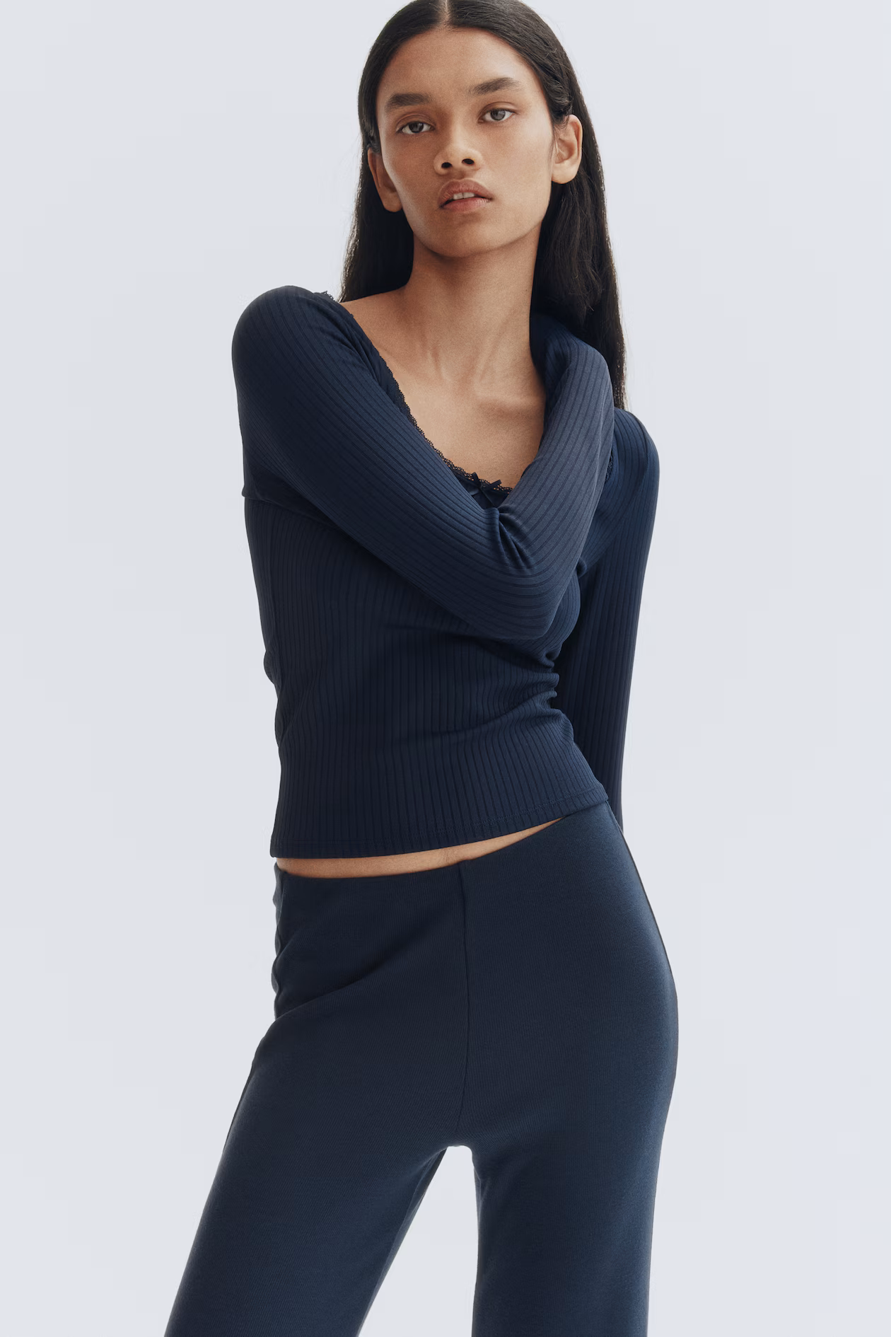 Skinny-fit trousers in a fine knit with a high, elasticated waist and flared legs.