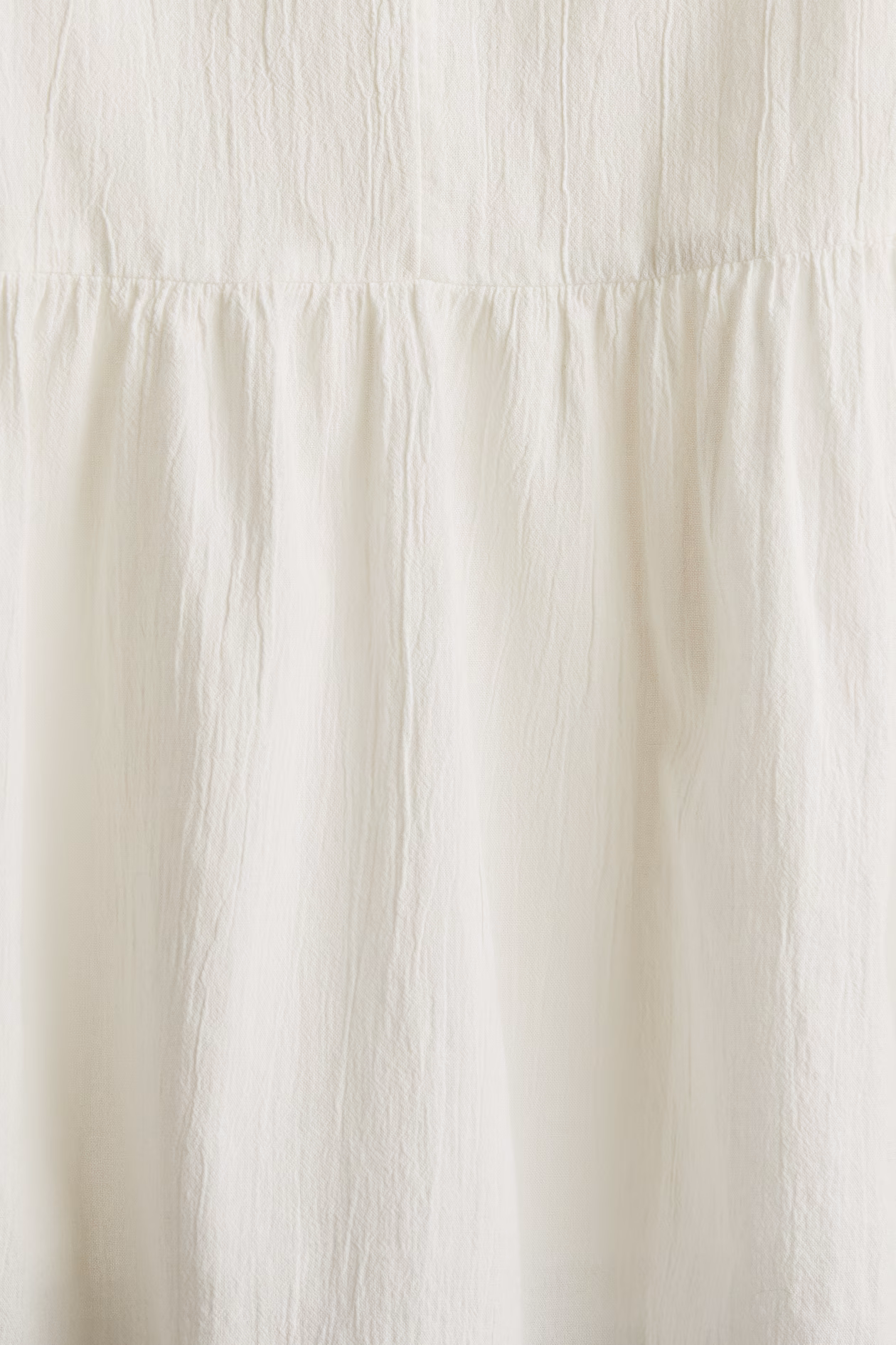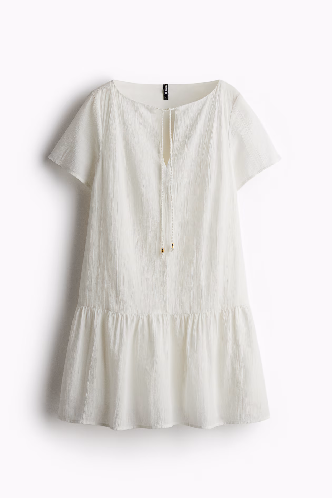 Short, loose-fit dress in woven, crinkled cotton. Round neckline, V-shaped opening at front with narrow, beaded-end ties, and short sleeves. Gathered seam below hips for a gentle flare to hem. Cotton lining.