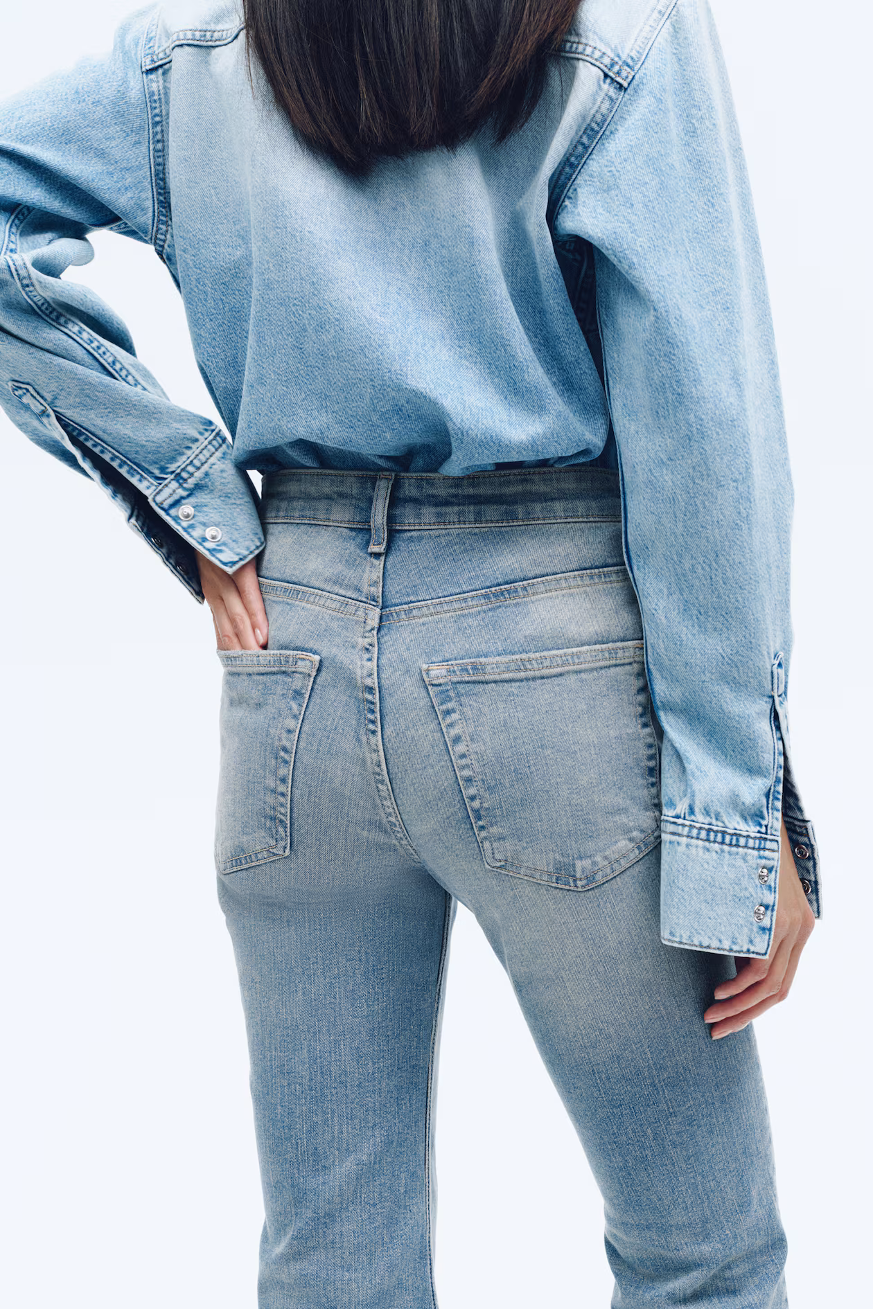 5-pocket jeans in cotton denim with gentle stretch for good comfort. Slim fit from waist to thigh and flared from knee to hem. High waist and zip fly with button. Flared, longer-length legs, designed to fall over foot with a stacking effect. Style with everything from crop tops to chunky knitwear.