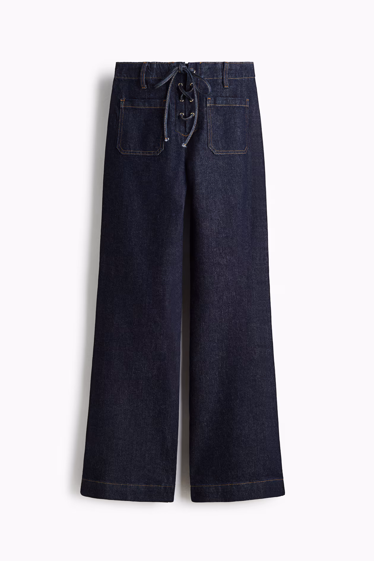 Jeans in denim with gentle stretch for good comfort. Slim fit from waist to thigh and flared from knee to hem. High waist, a lace-up fly, front pockets, and back pockets. Flared, regular-length legs, designed to fall at top of foot with little or no stacking. A defining shape from season to season.