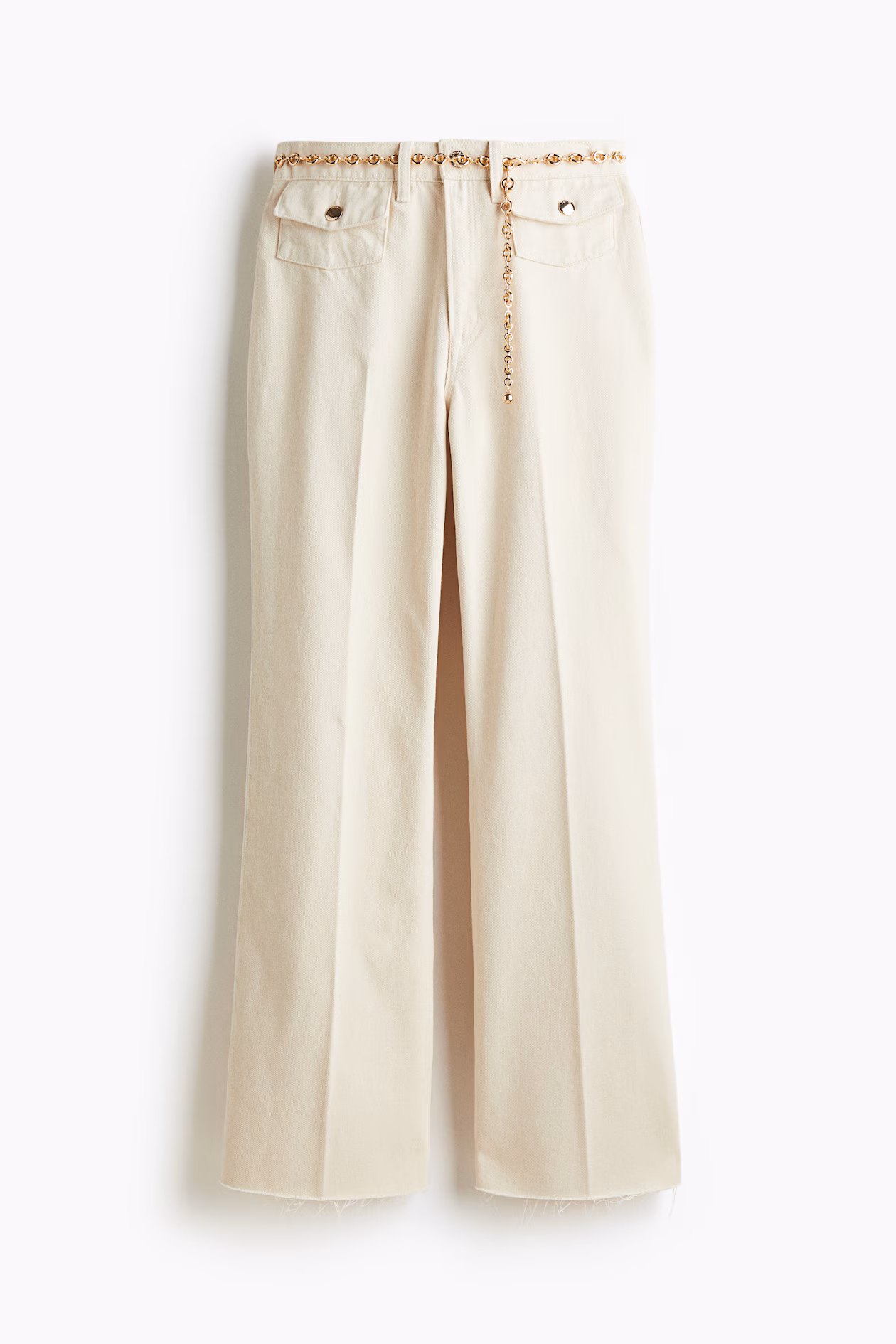 Jeans in rigid cotton denim that feels firm at first, softening and relaxing with wear. Slim fit from waist to thigh and flared cut from knee to hem. High waist, metal chain belt, and zip fly with button. Front pockets with flap and button, open back pockets, and creases at front and back. Raw-edge hems. Regular length, designed to fall at top of foot with little or no stacking. A defining shape from season to season.