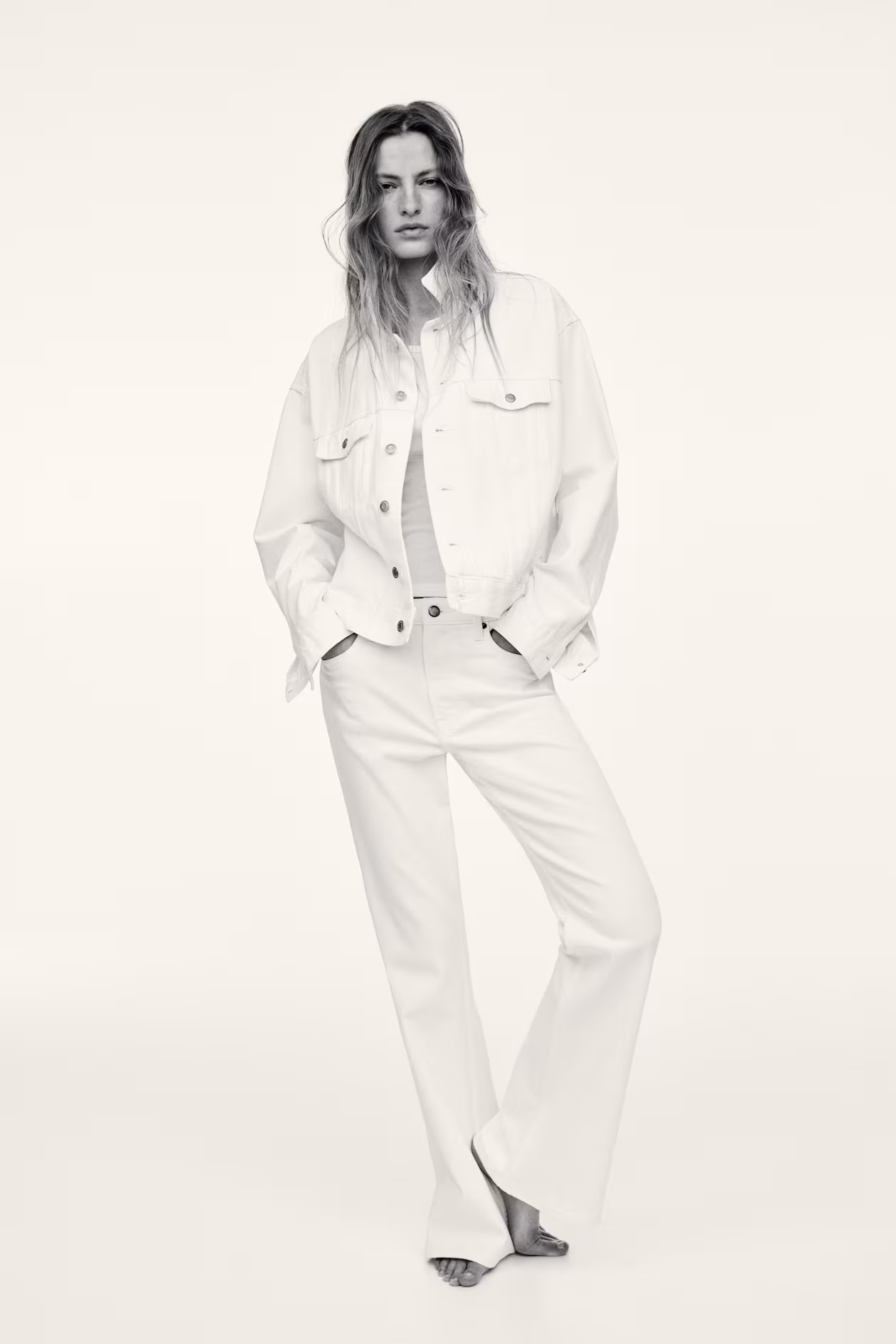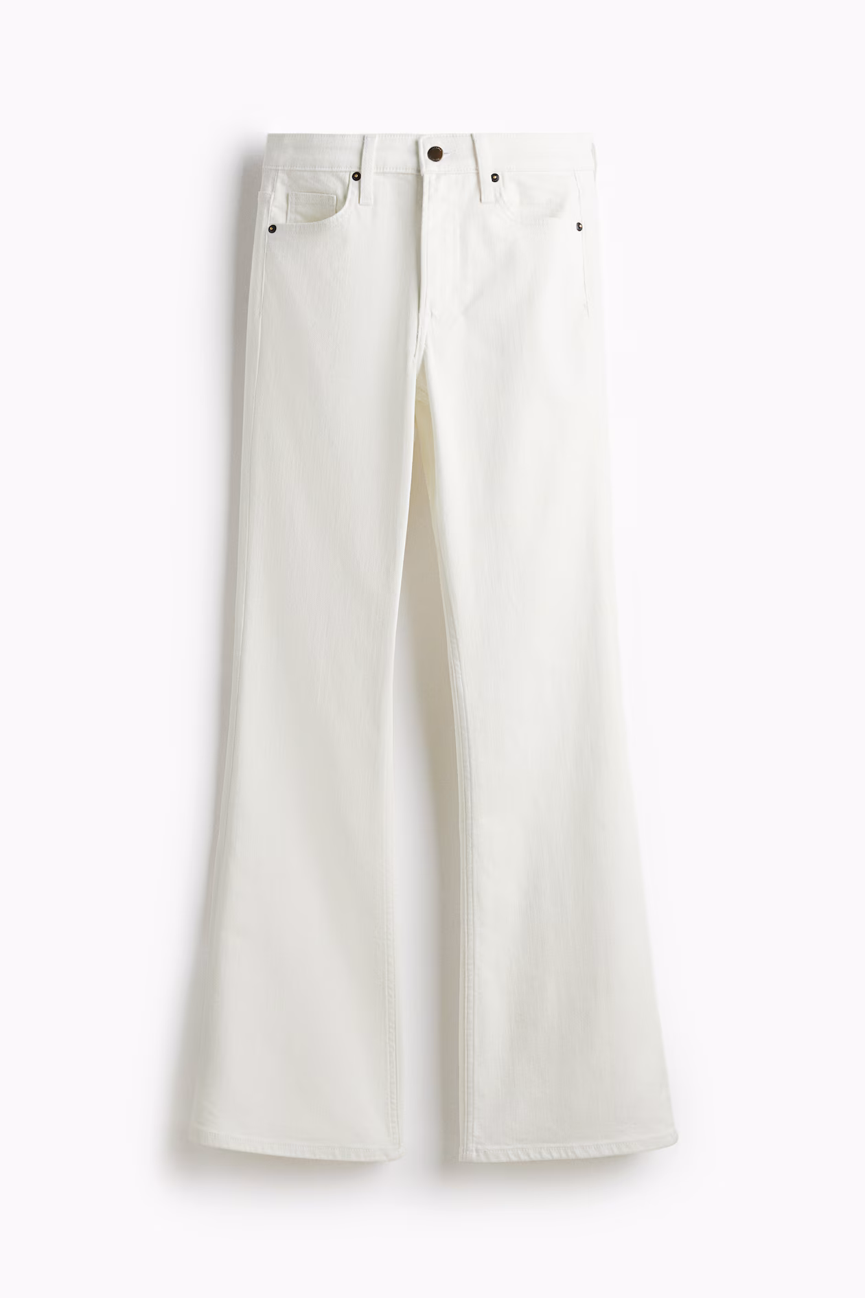 5-pocket jeans in cotton denim with gentle stretch for good comfort. Slim fit from waist to thigh and flared from knee to hem. High waist and zip fly with button. Flared, longer-length legs, designed to fall over foot with a stacking effect. Style with everything from crop tops to chunky knitwear.