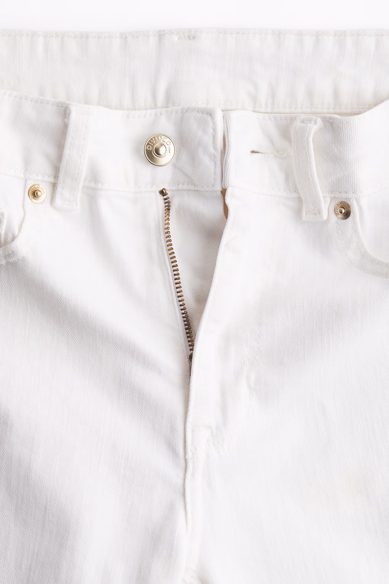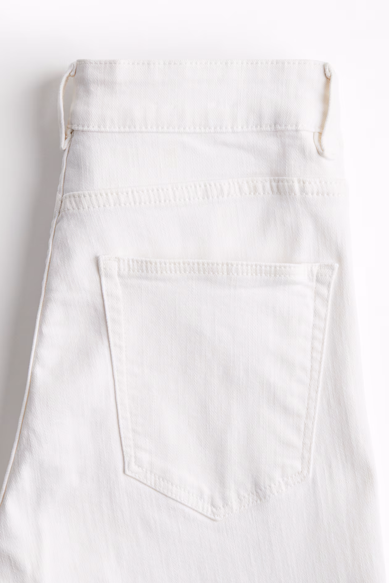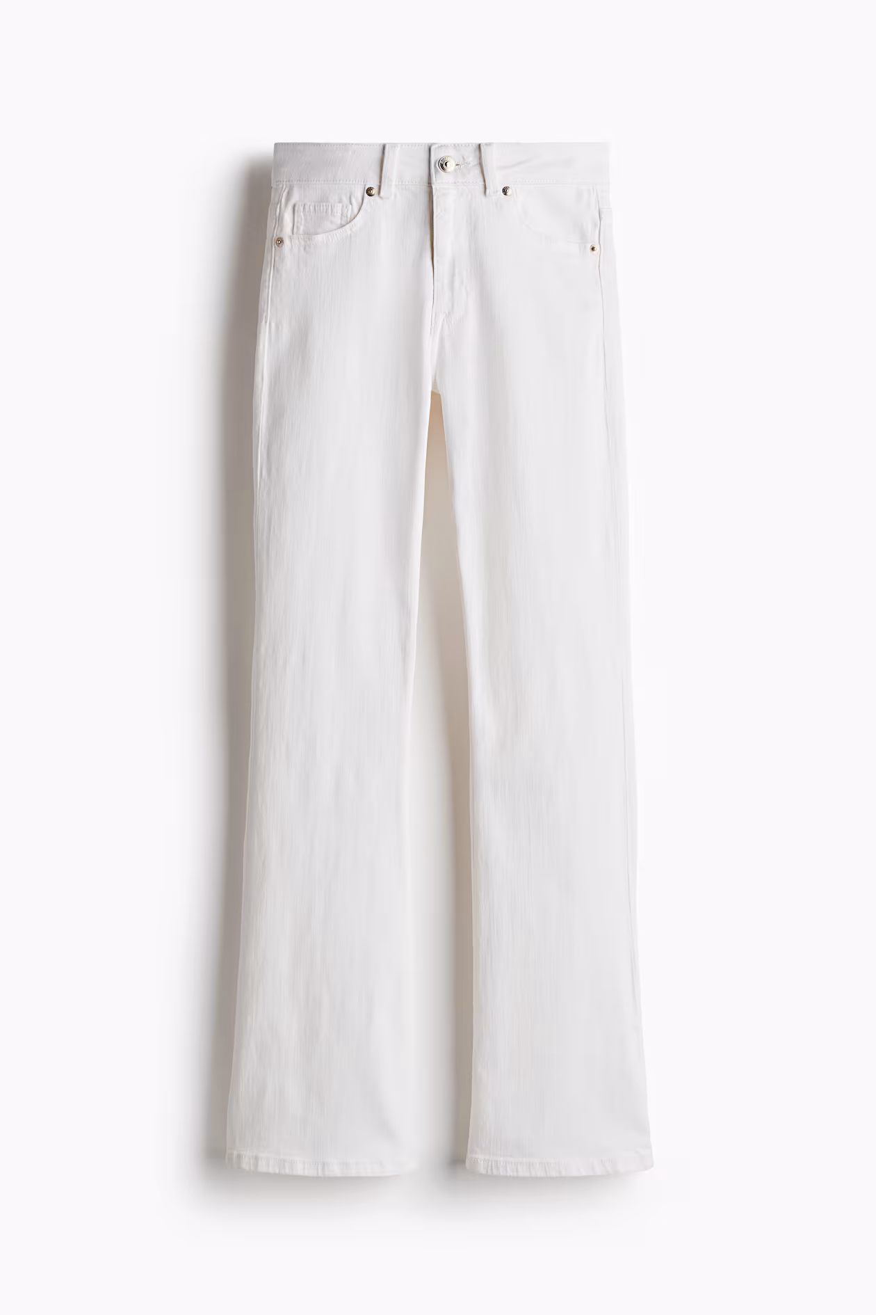 Jeans in denim with good stretch for added comfort. Slim fit from waist to thigh and flared from knees to hems. High waist and zip fly with button. Mock front pockets, a coin pocket, and open back pockets. Flared, regular-length legs, designed to fall at top of foot with little or no stacking. A defining shape from season to season.