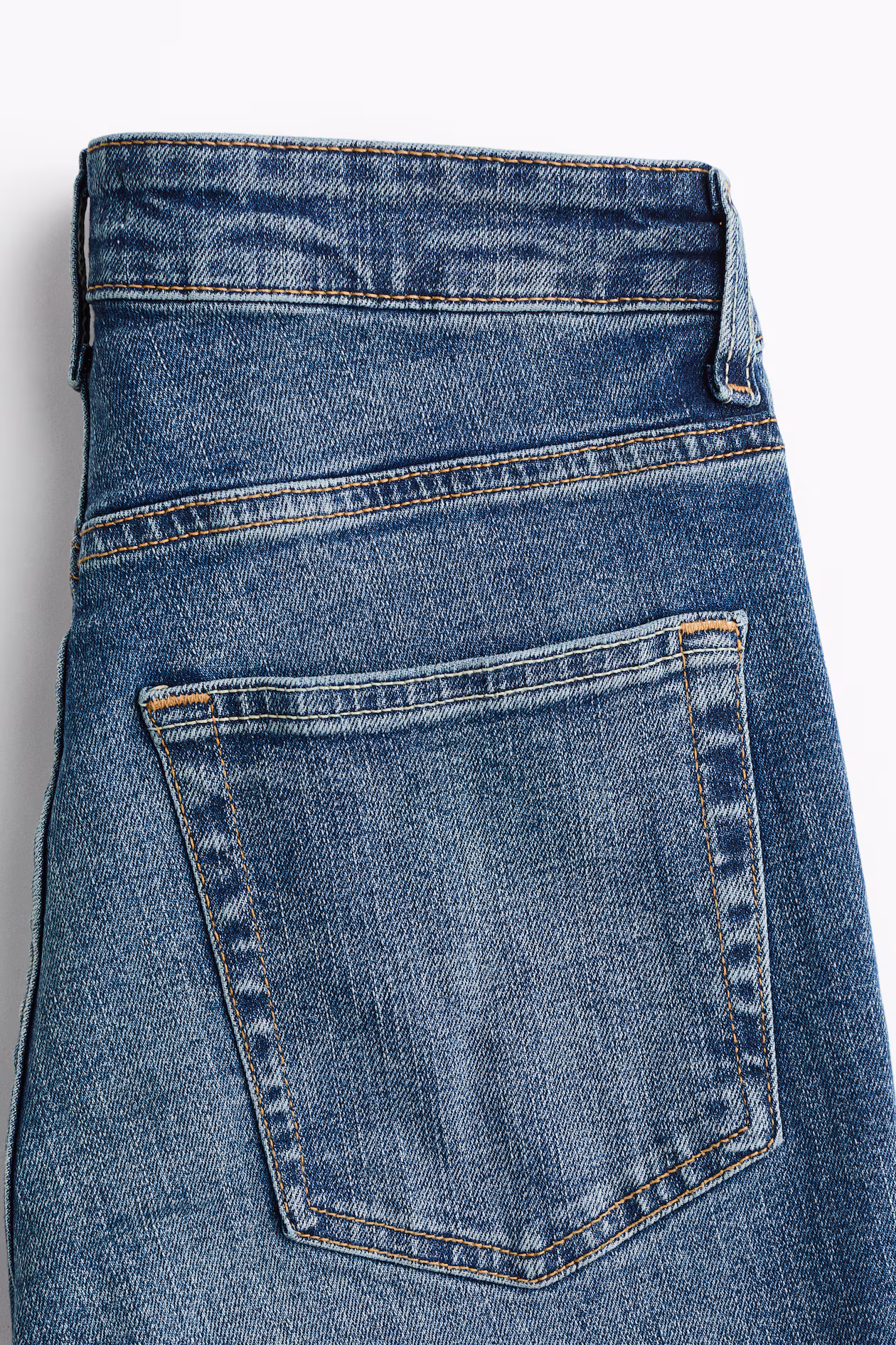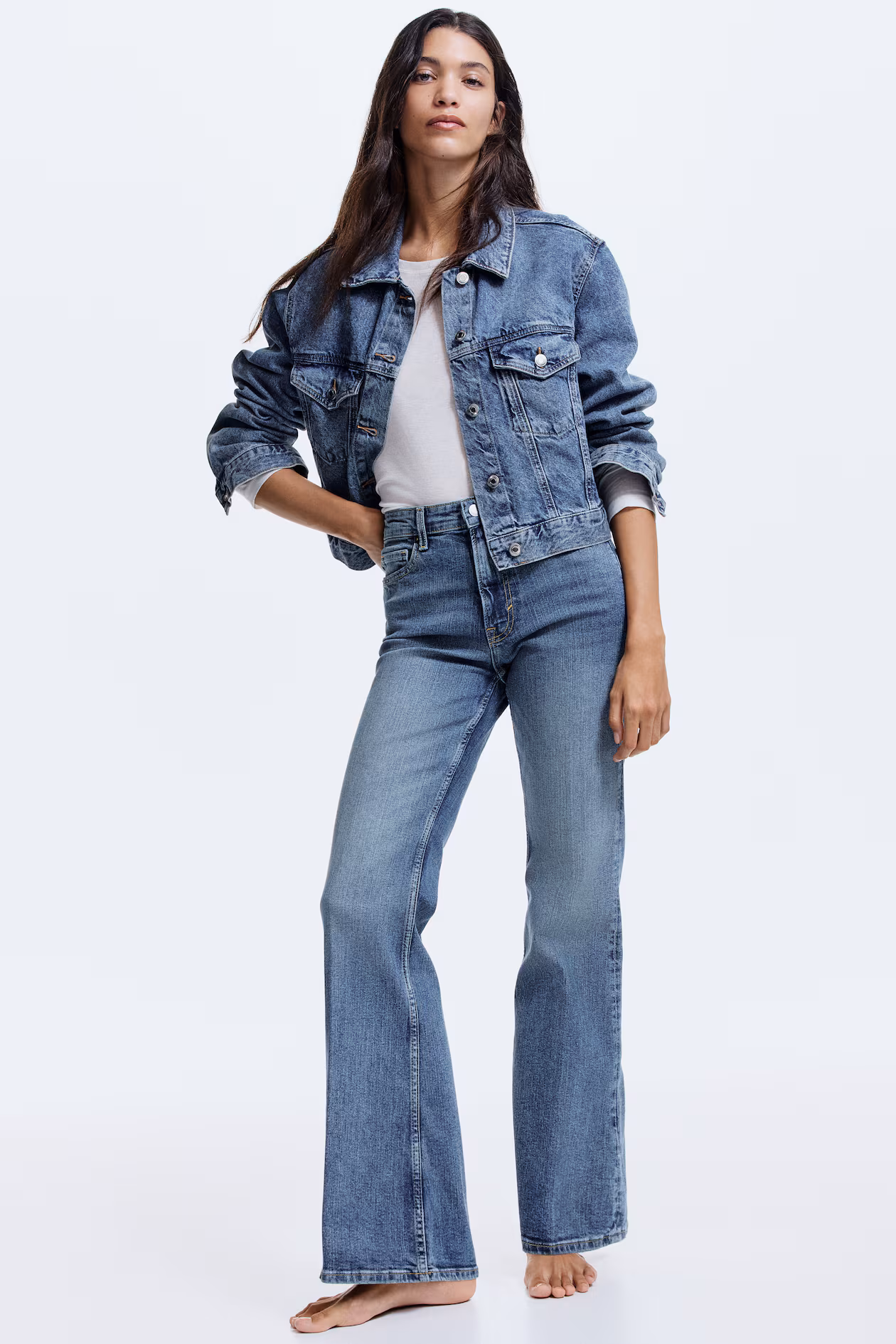 5-pocket jeans in cotton denim with gentle stretch for good comfort. Slim fit from waist to thigh and flared from knee to hem. High waist and zip fly with button. Flared, longer-length legs, designed to fall over foot with a stacking effect. Style with everything from crop tops to chunky knitwear.