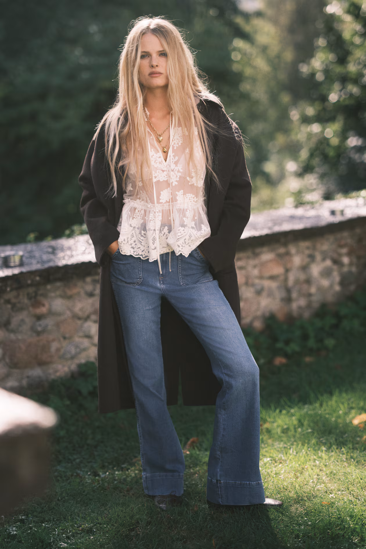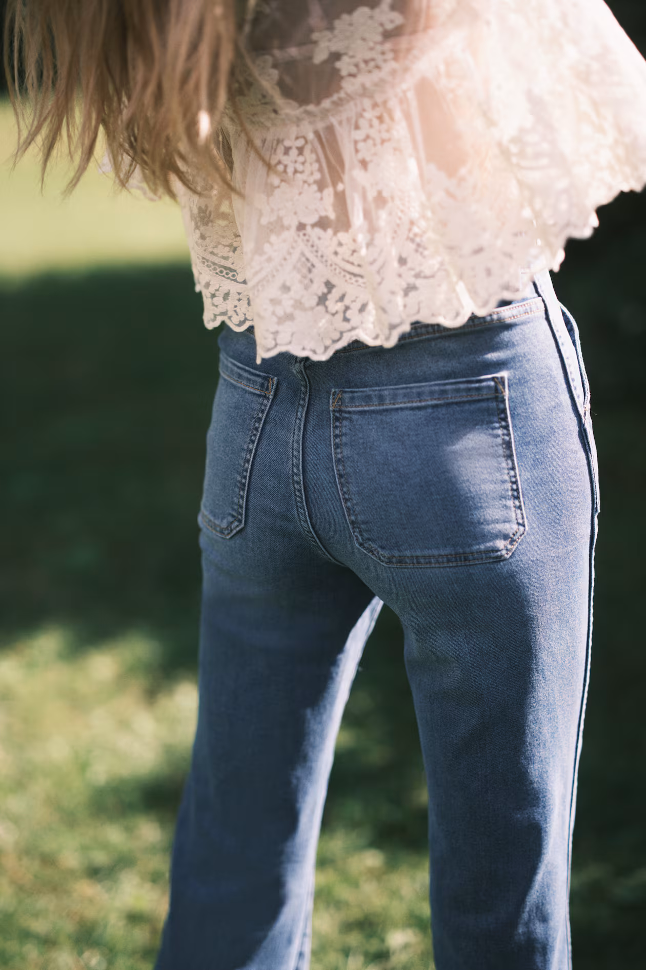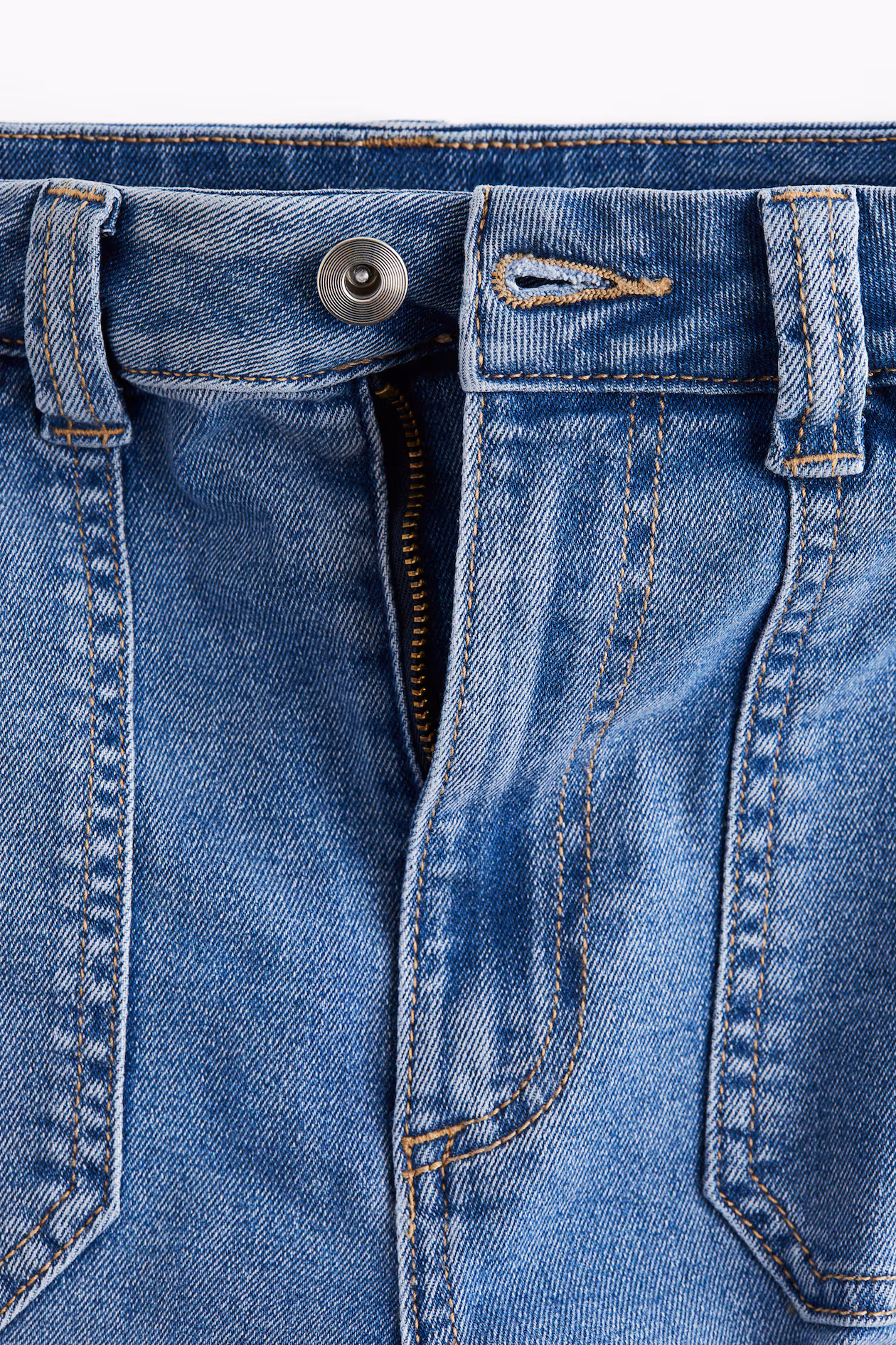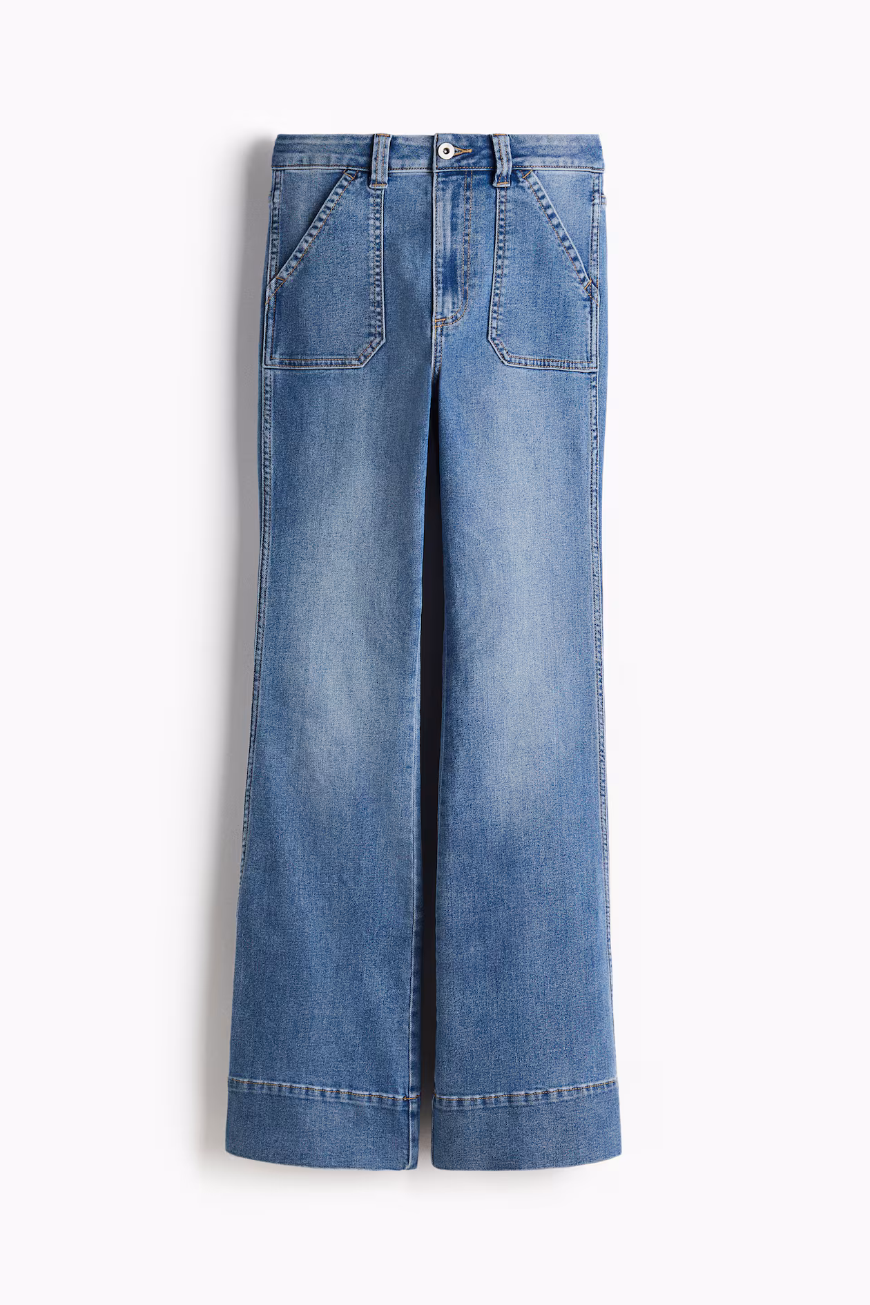 Jeans in denim with gentle stretch for good comfort. Slim fit from waist to thigh and flared from knee to hem. High waist, zip fly with button, diagonal patch front pockets, and open back pockets. Flared, regular-length legs, designed to fall at top of foot with little or no stacking. Style with everything from sneakers to ankle boots.