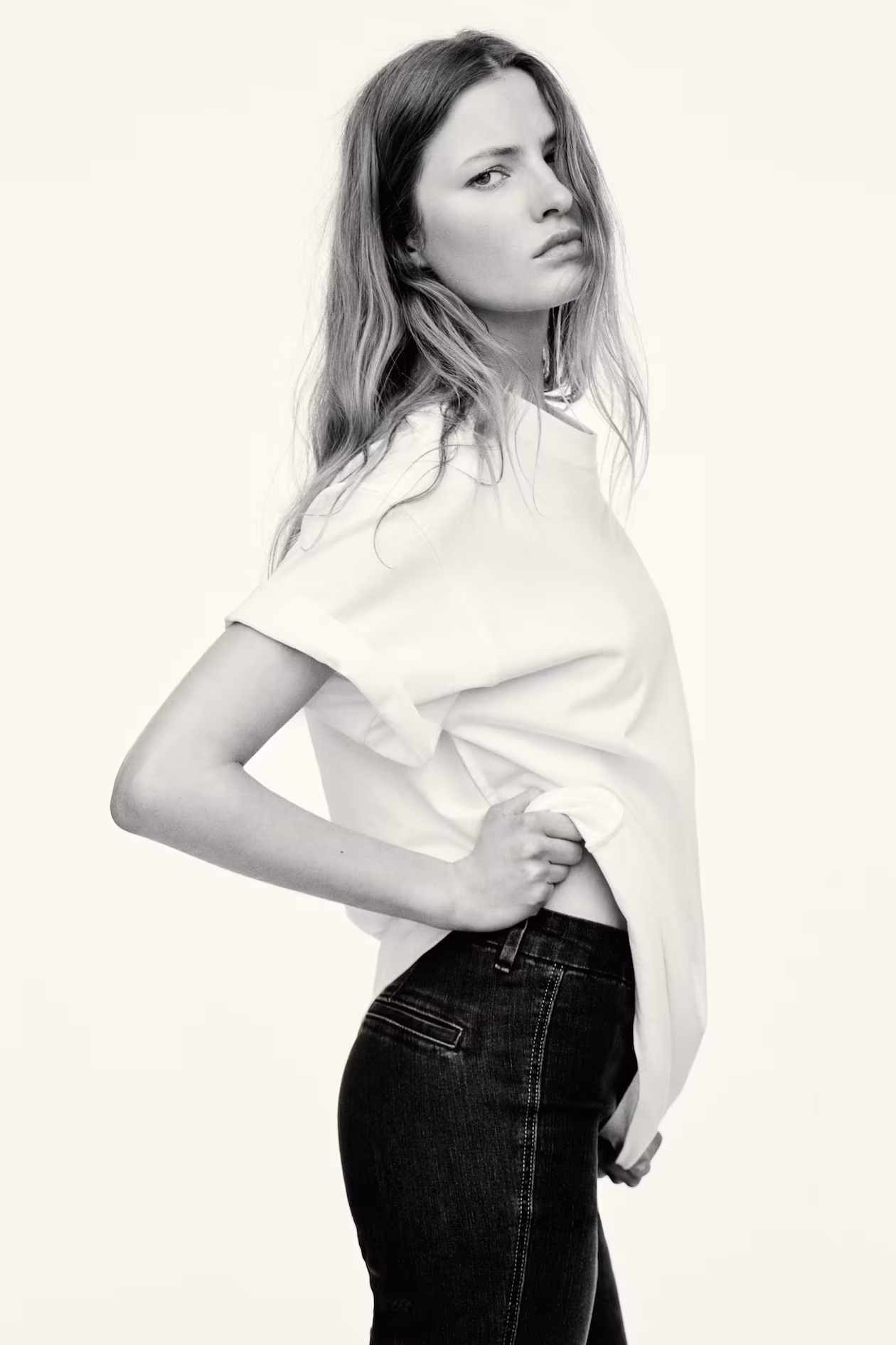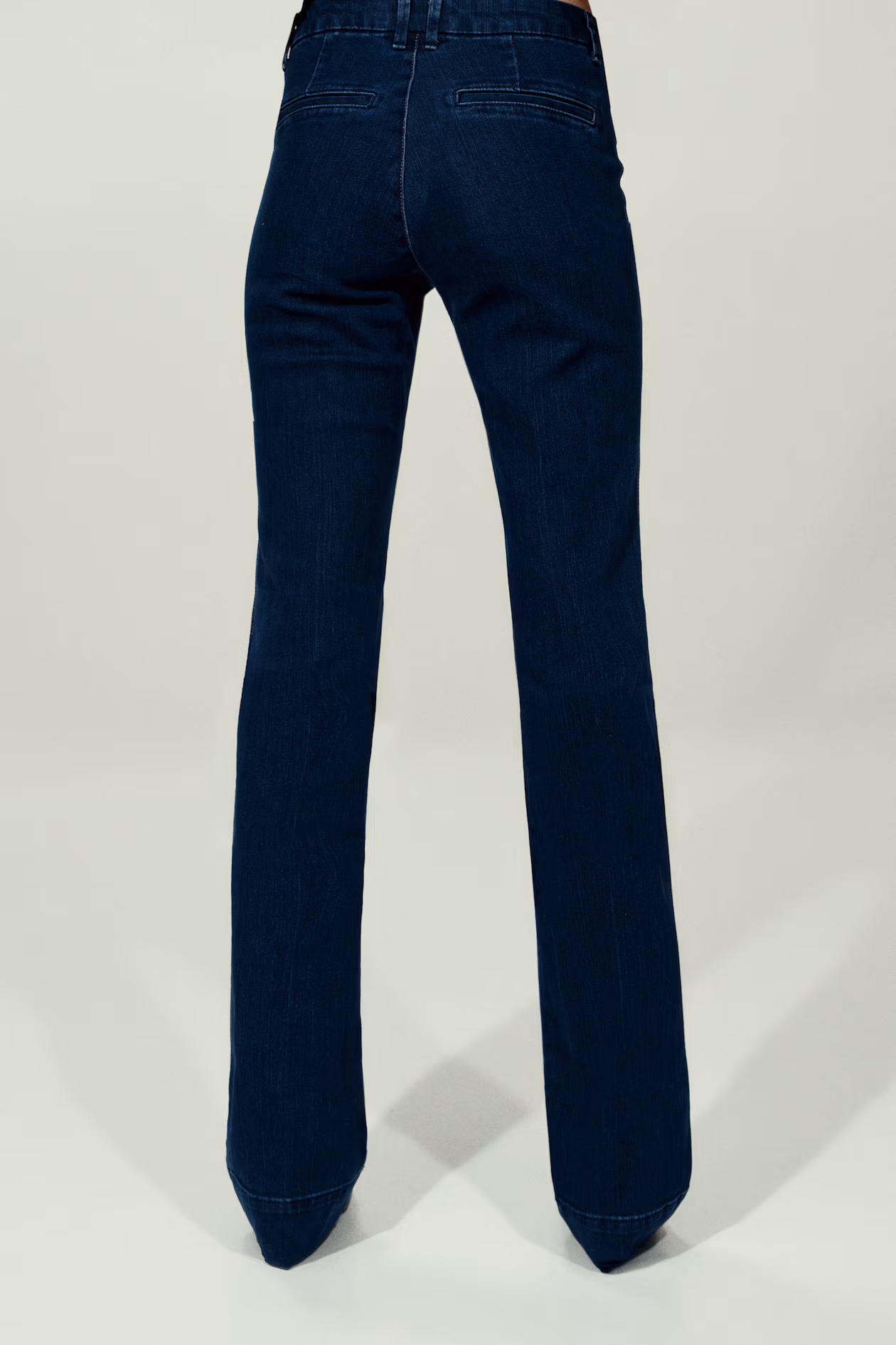 Jeans in denim with a soft handfeel and gentle stretch for good comfort. Slim fit from waist to thigh and flared from knee to hem. High waist, zip fly with button, and welt back pockets. Regular length, designed to fall at top of foot with little or no stacking. A defining shape from season to season.
