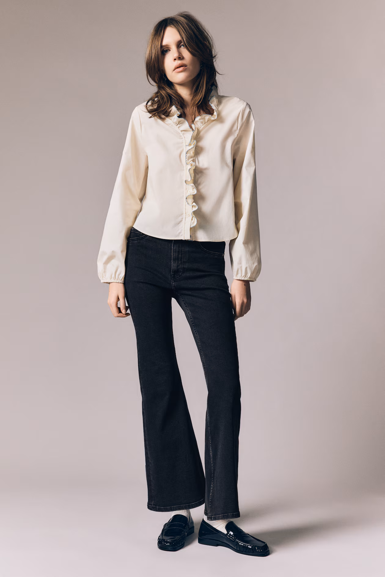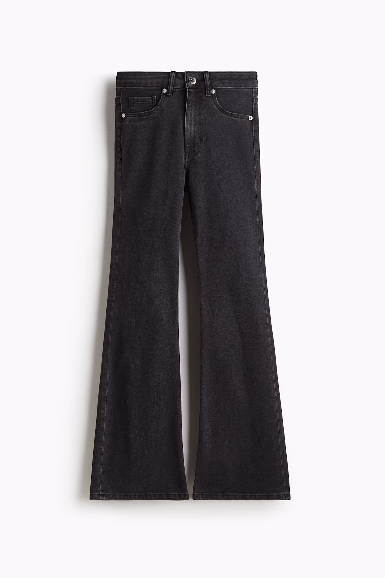Jeans in slightly stretchy denim with a high waist, zip fly and button and legs with wide, flared hems. Fake front pockets and real pockets at the back.