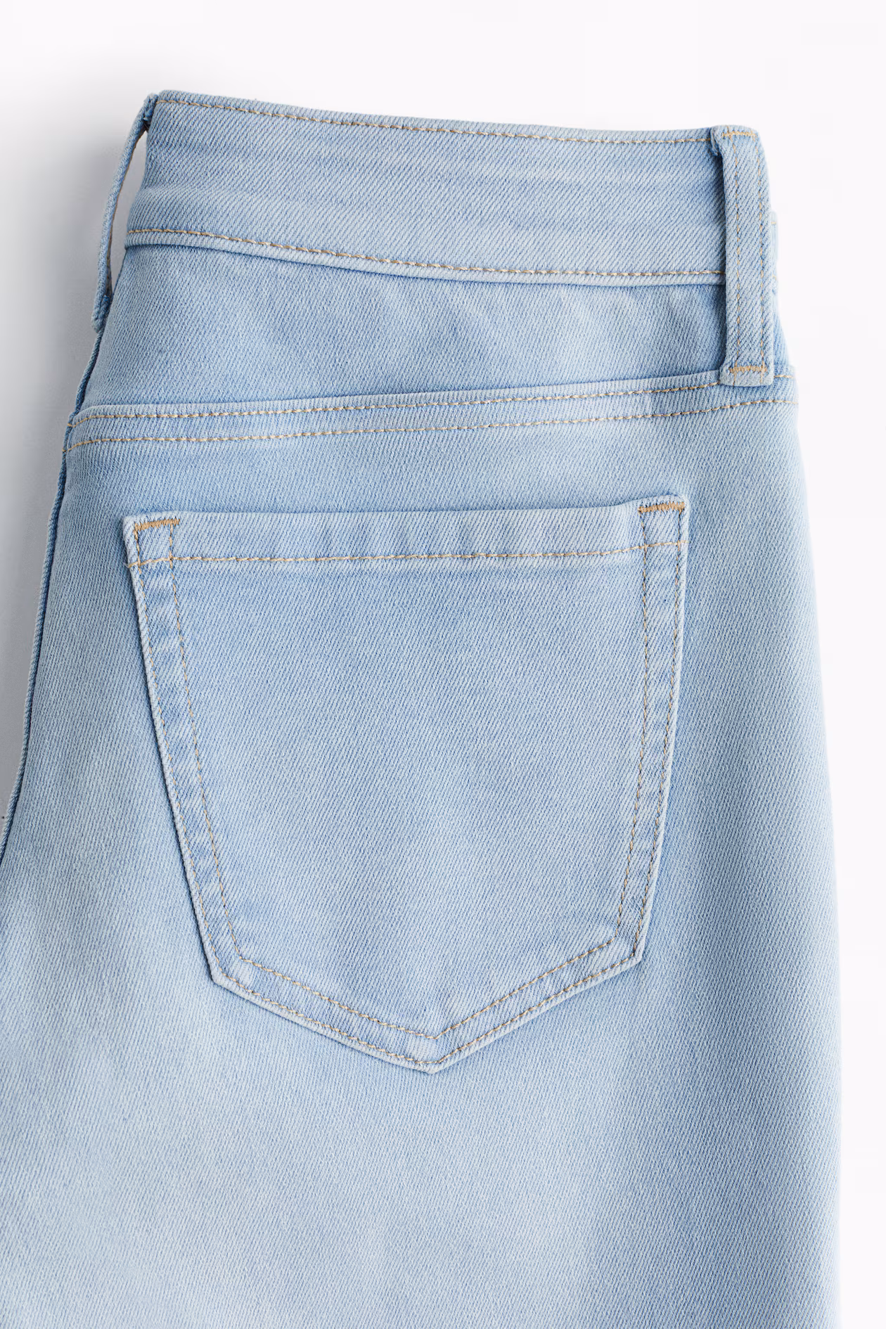 Ankle-length jeans in denim with gentle stretch for good comfort. Slim fit from waist to thigh and flared from knee to hem. Low waist and zip fly with button. Front pockets with flap and snap fastener, open back pockets, and flared legs. A defining shape from season to season.