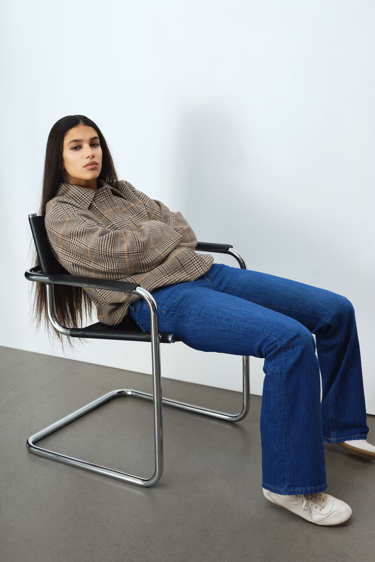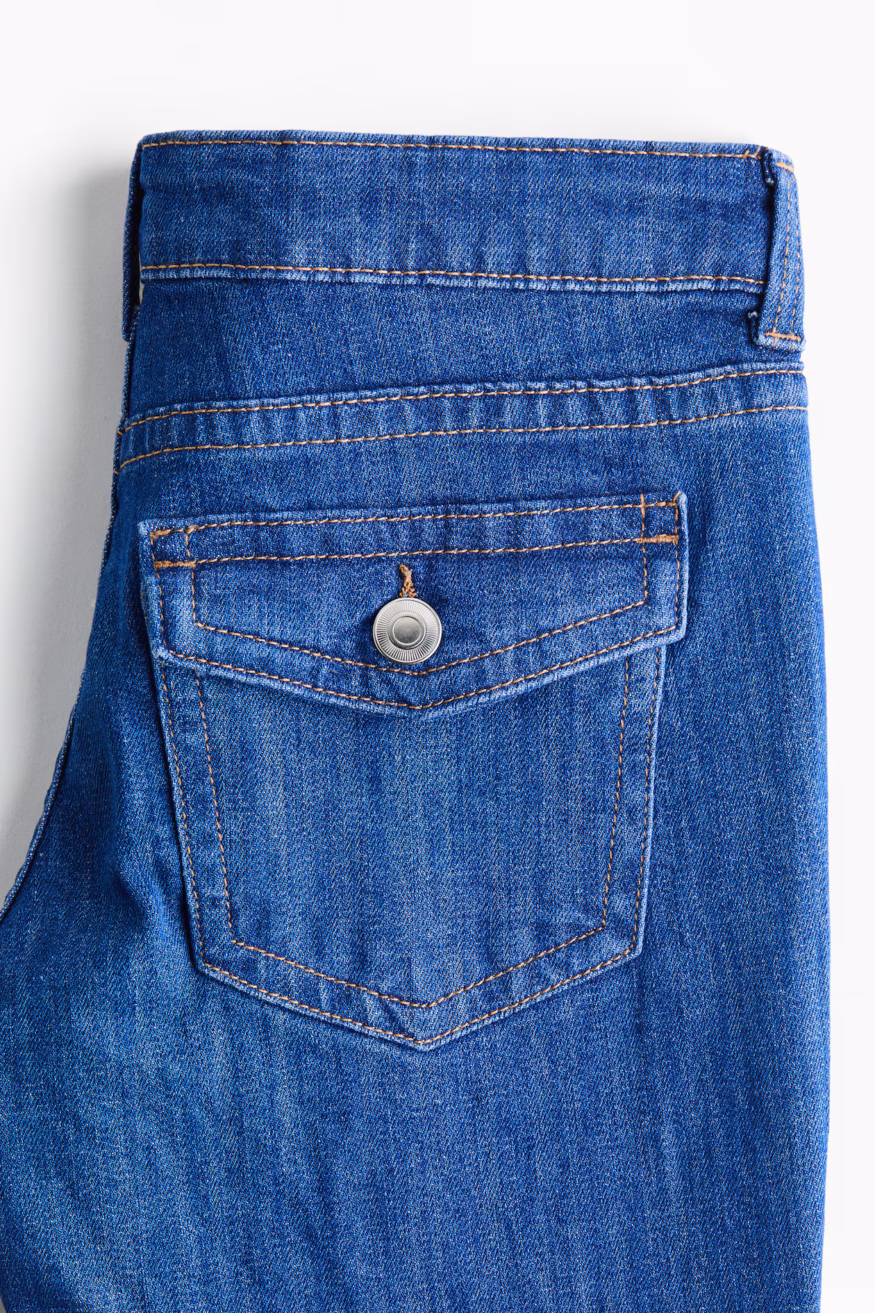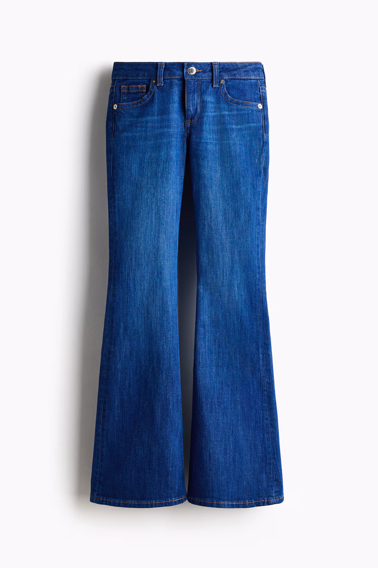 Jeans in stretch denim for excellent comfort. Slim fit from waist to thigh and flared from knee to hem. Low waist and zip fly with button. Open front pockets and back pockets with flap and button. Regular-length legs, designed to fall at top of foot with little or no stacking. Style with everything from sneakers to ankle boots.