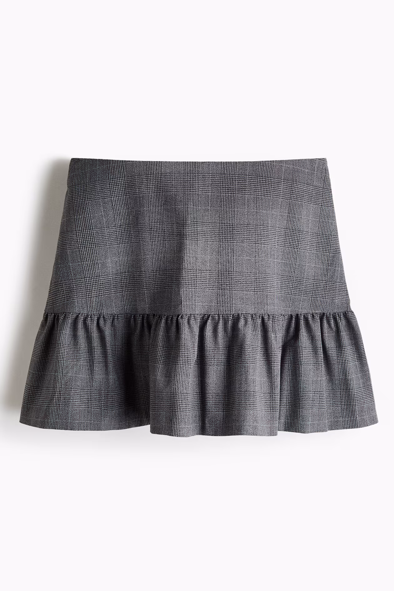 Fitted mini skirt in woven fabric. Regular waist, concealed zipper at one side, and a gathered seam above hem for a flared silhouette. Partially lined.