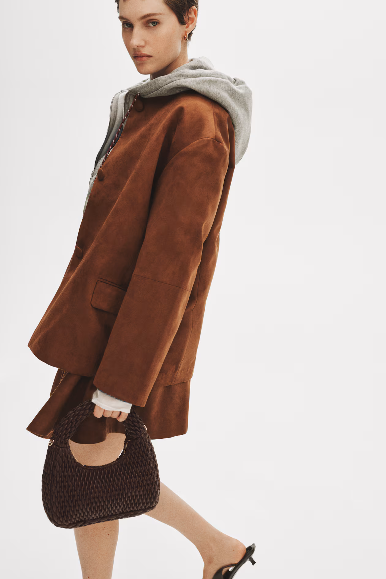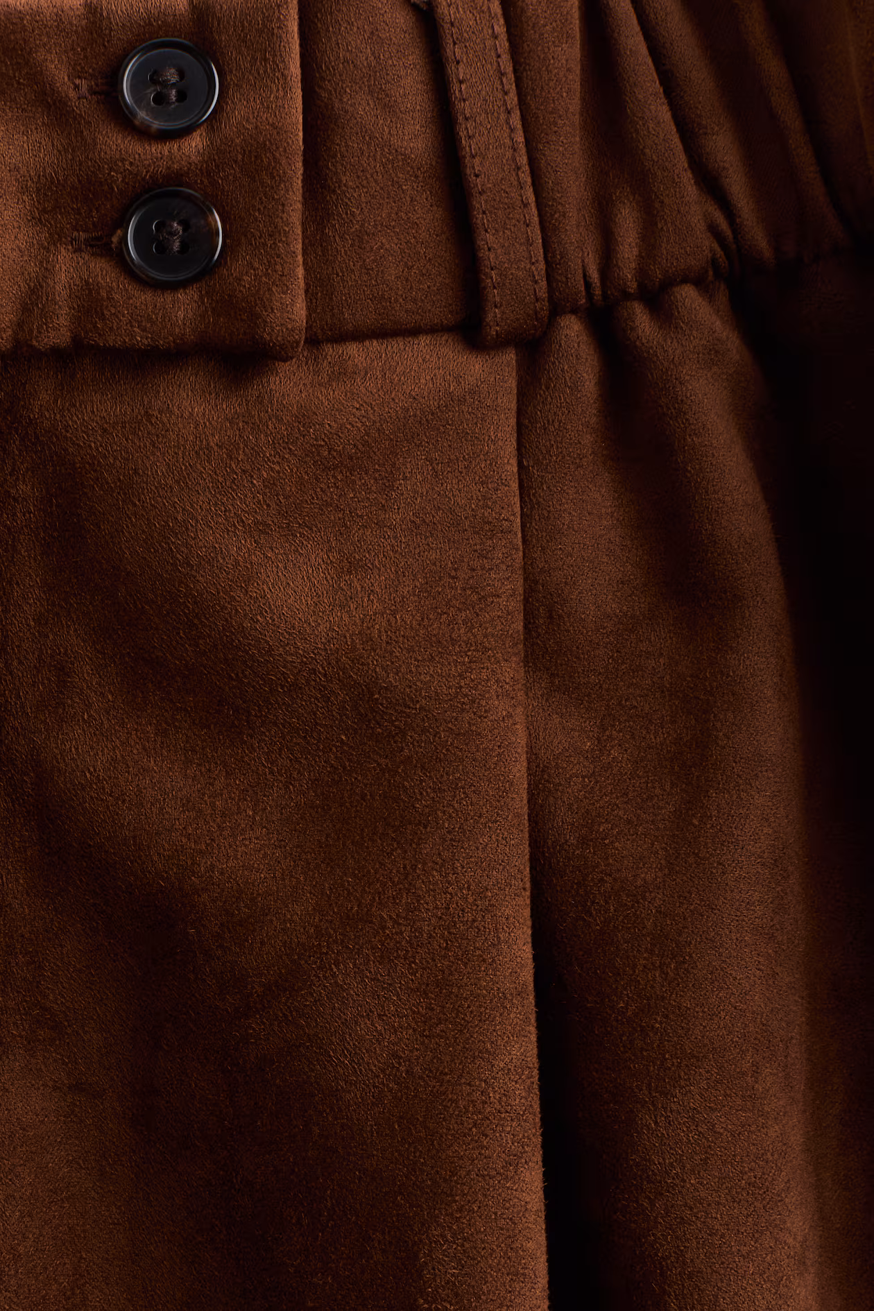 Flared mini skirt in woven fabric with a soft, napped finish. Regular waist, extended waistband tab with buttons, covered elastic at sides of waistband, and a zip fly. Gathers at top and discreet side pockets. Lined.