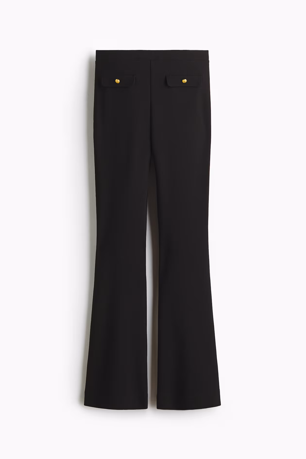 Flared pants in ponte jersey. Concealed, elasticized waistband and decorative front pocket flaps with button.