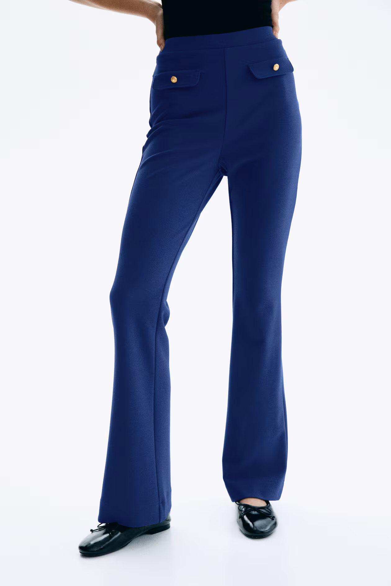 Flared pants in ponte jersey. Concealed, elasticized waistband and decorative front pocket flaps with button.
