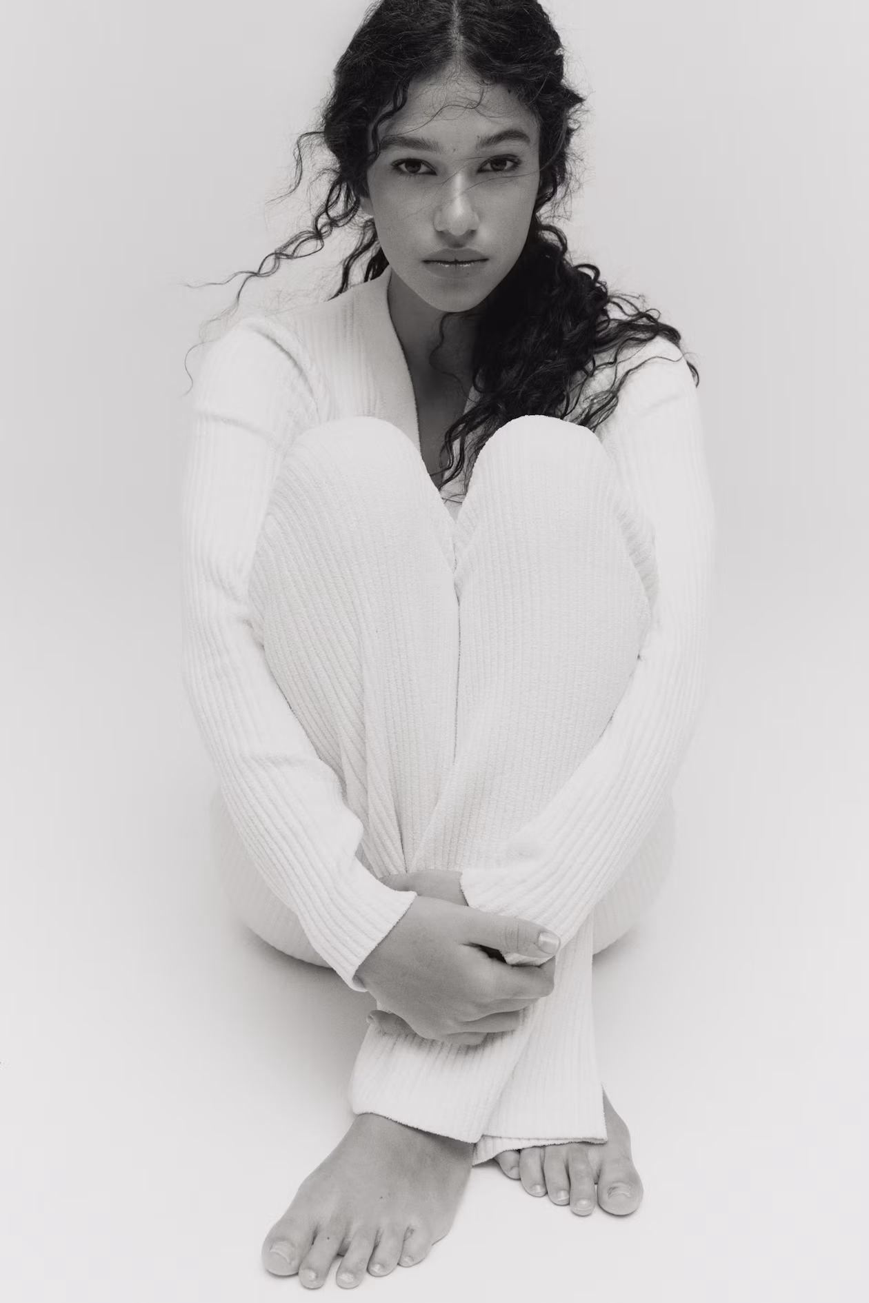 Soft, rib-knit pants. Elasticized waistband and flared legs.