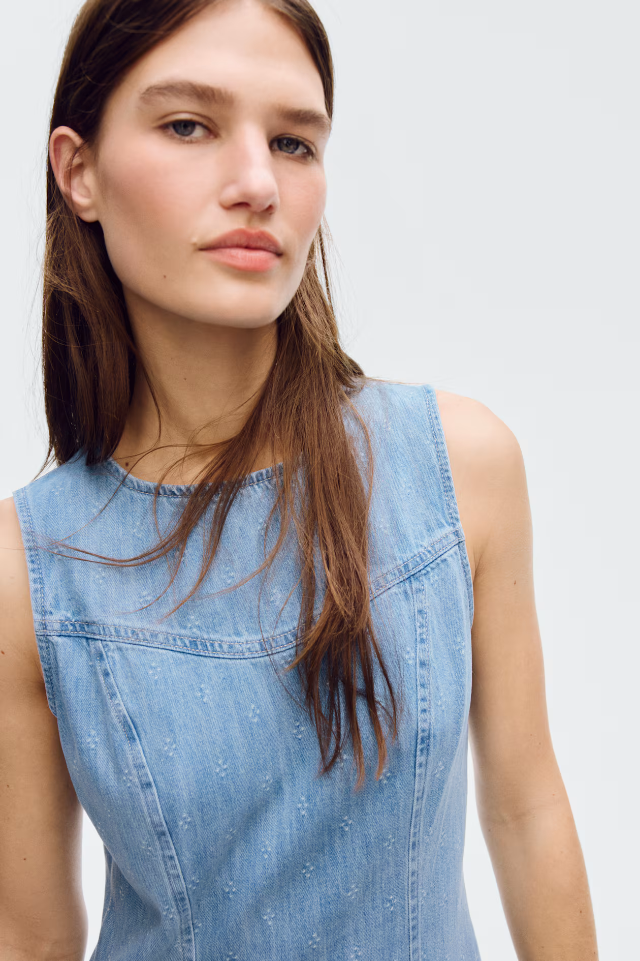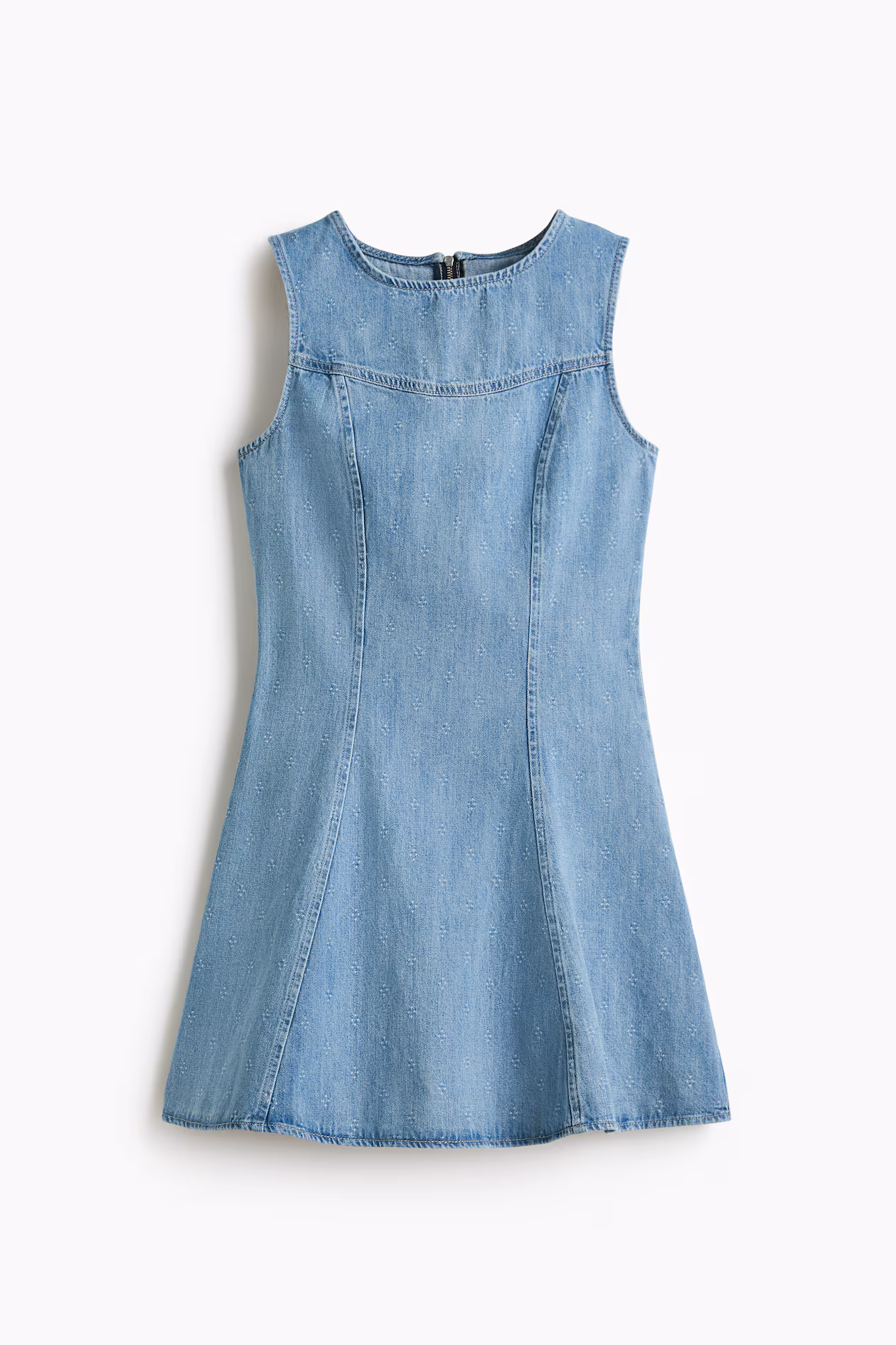 Sleeveless mini dress in rigid cotton denim with a woven dot pattern. Fitted bodice and flared skirt. Round neckline, zipper at back, and a yoke at front and back. Vertical shaping seams at front and back.