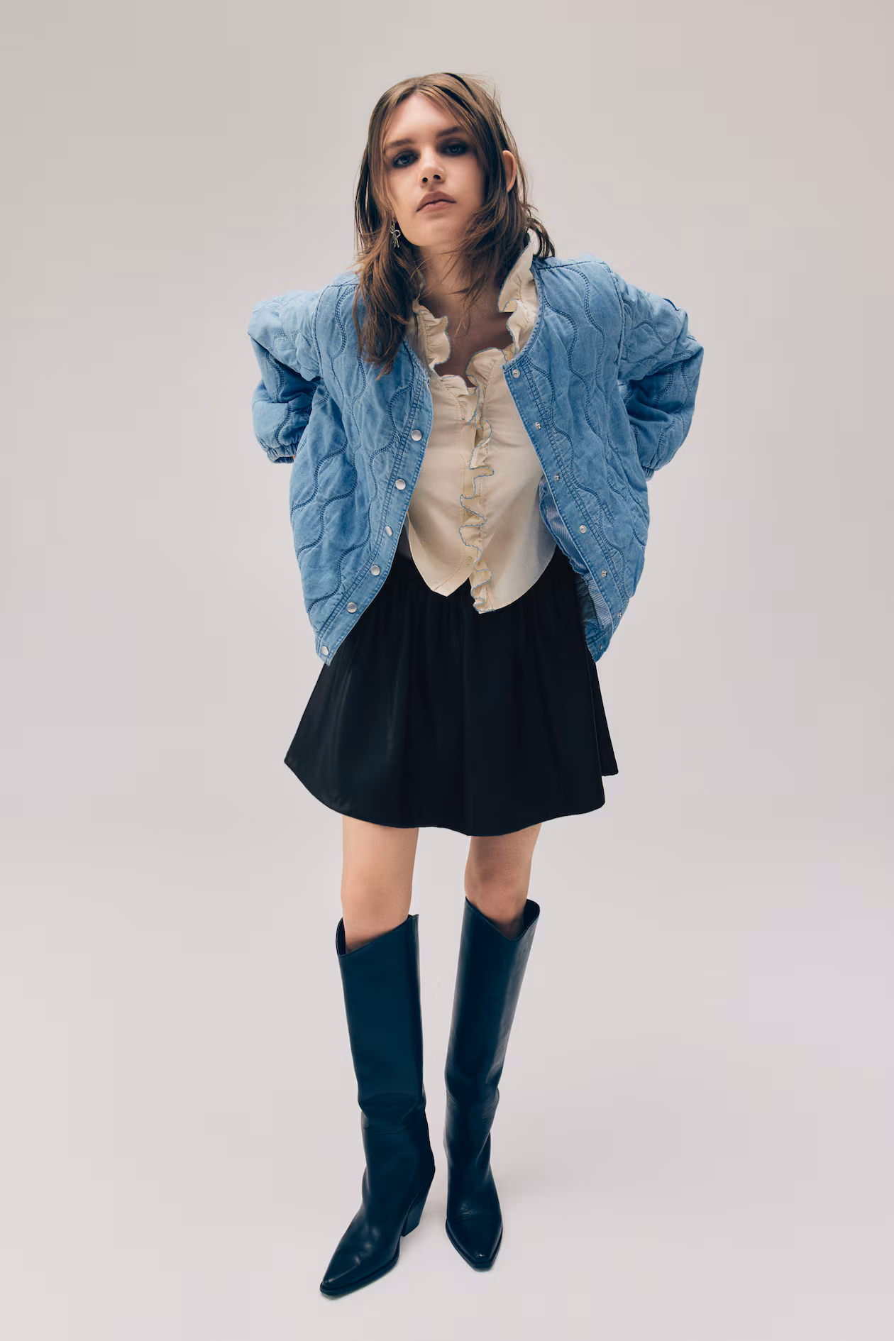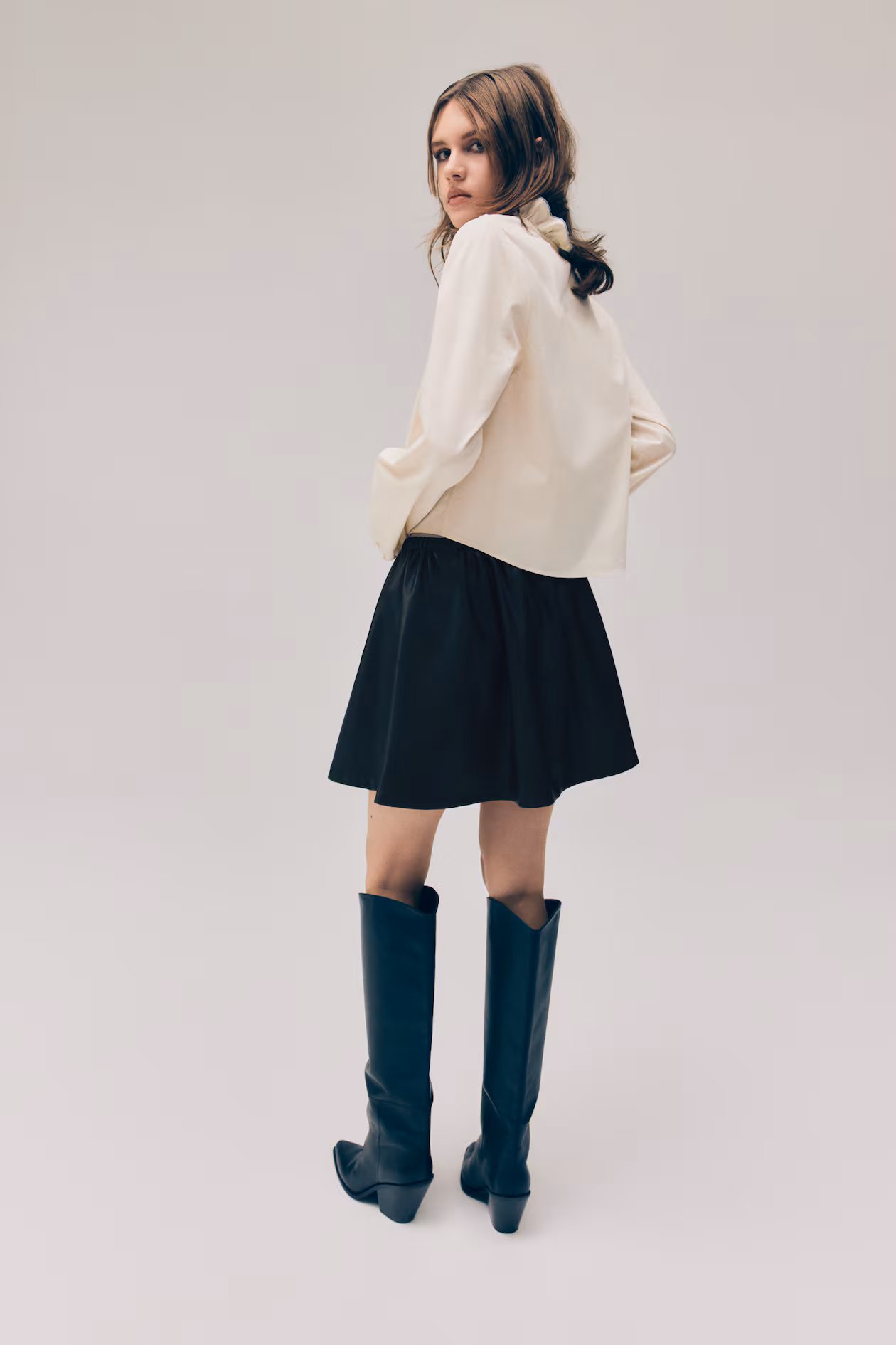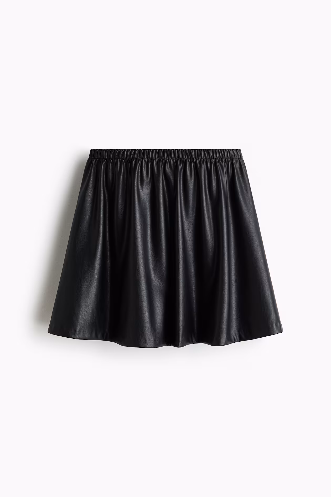 Short, flared, loose-fit skirt with covered elastic at waistband. Unlined.